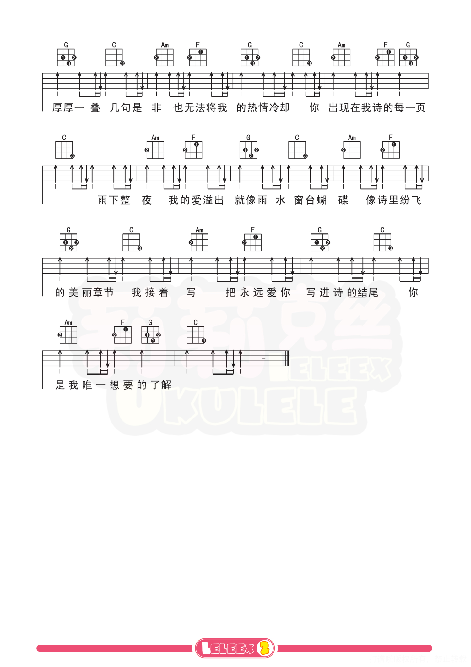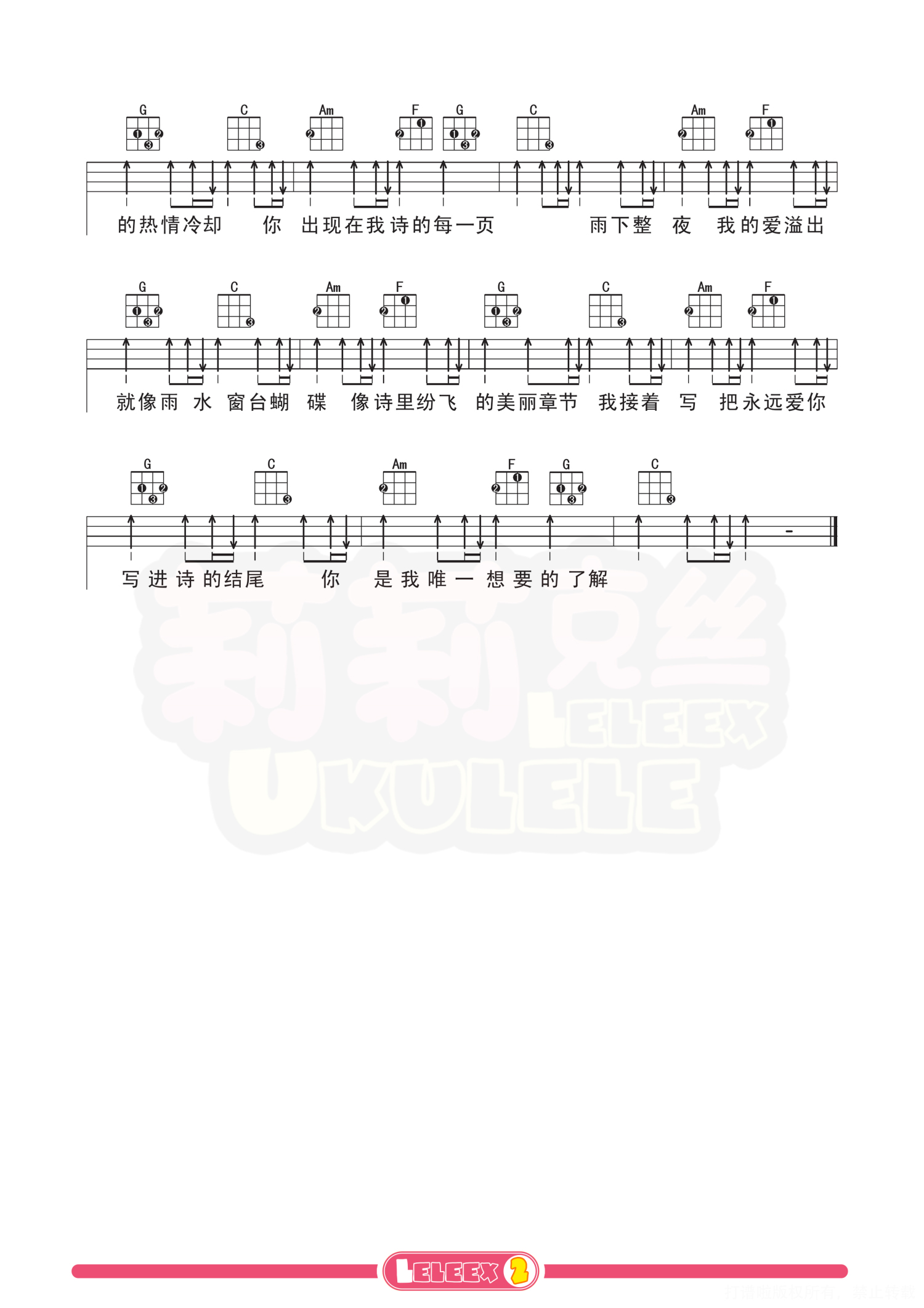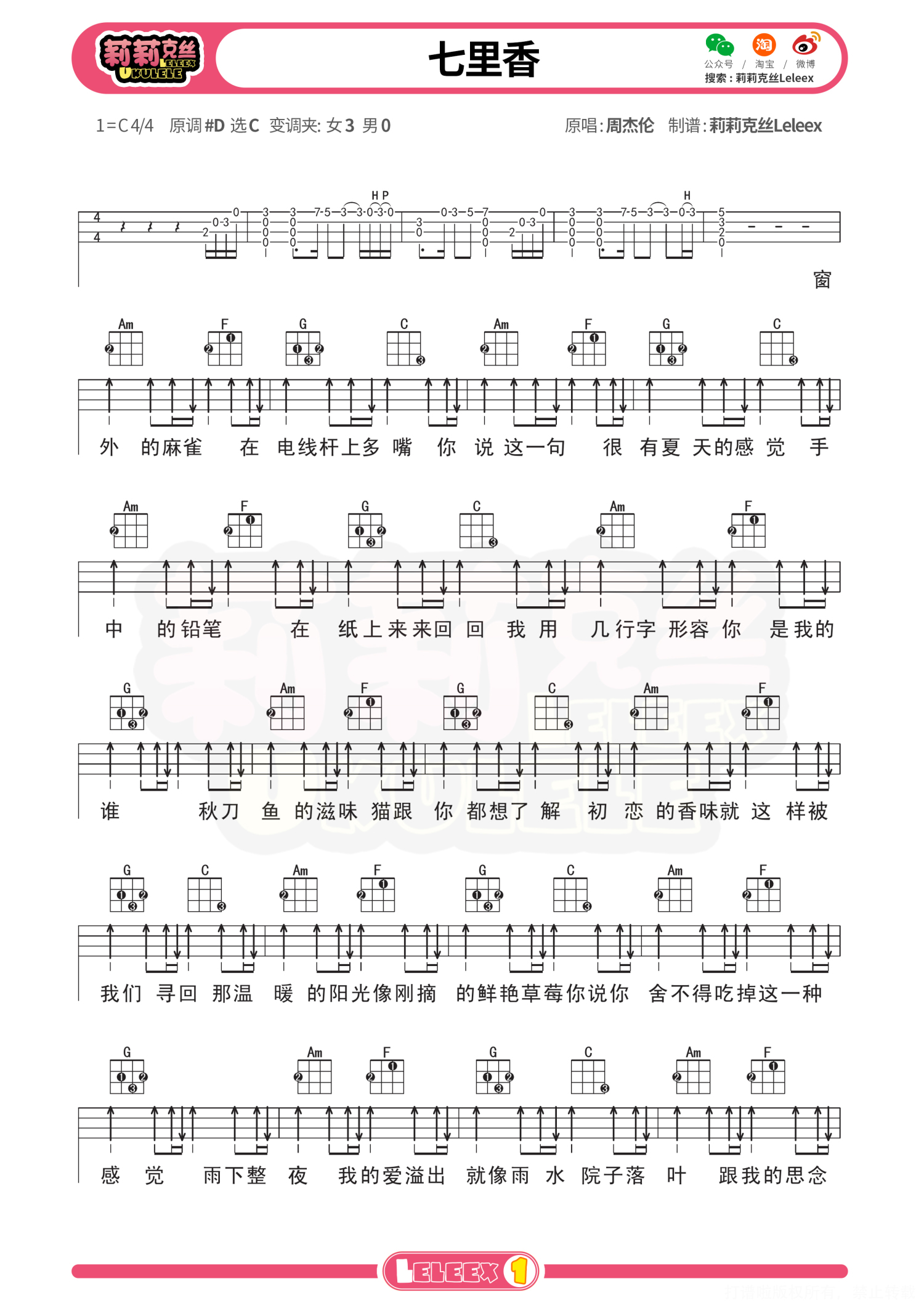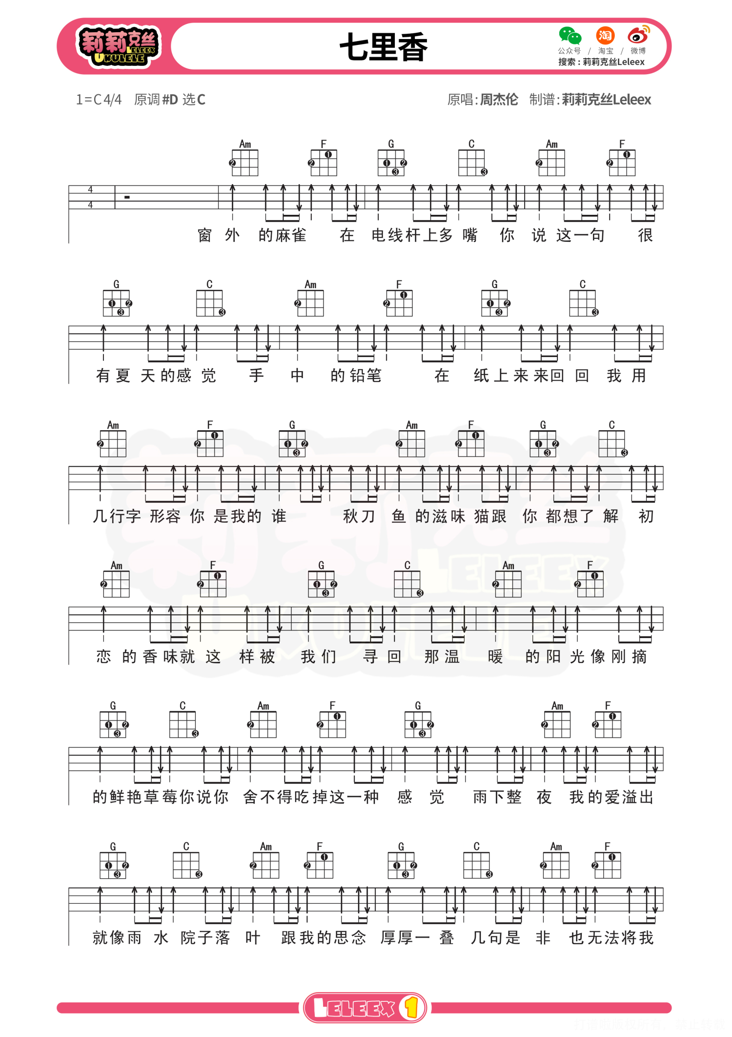 曲谱介绍: 《七里香》尤克里里曲谱+教学   弹唱教学 曲谱(简单无前奏版)带前奏版在下方 有前奏版曲谱*(无基础初学者可以略过前奏) 更多尤克里里曲谱/教学  关注@莉莉克丝Leleex