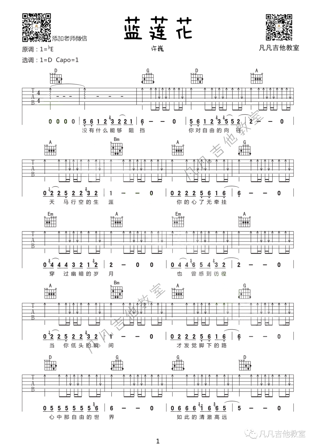 曲谱介绍: 许巍《蓝莲花》吉他弹唱谱,采用D调指法编配,凡凡吉他教室编配出品,共有2张高清图谱,免翻页排版设计。