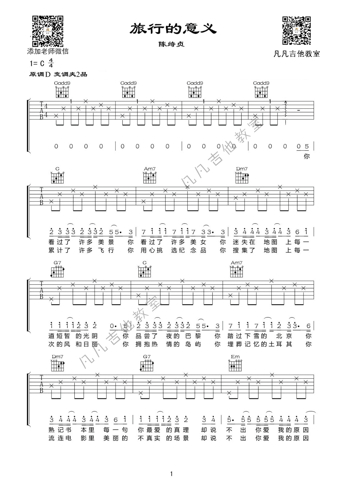 曲谱介绍: 陈绮贞《旅行的意义》吉他弹唱谱,采用D调指法编配,凡凡吉他教室编配出品,共有2张高清图谱,免翻页排版设计。