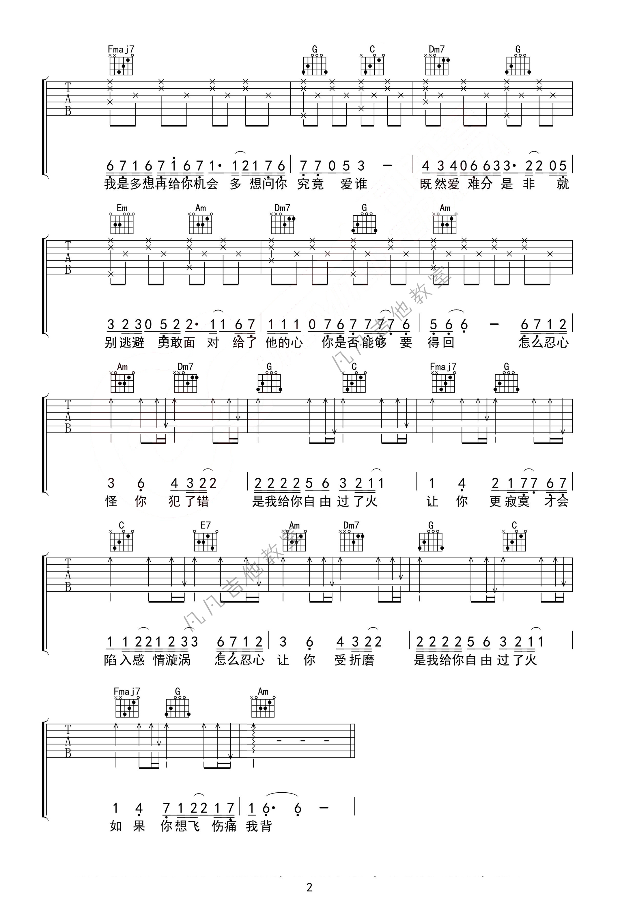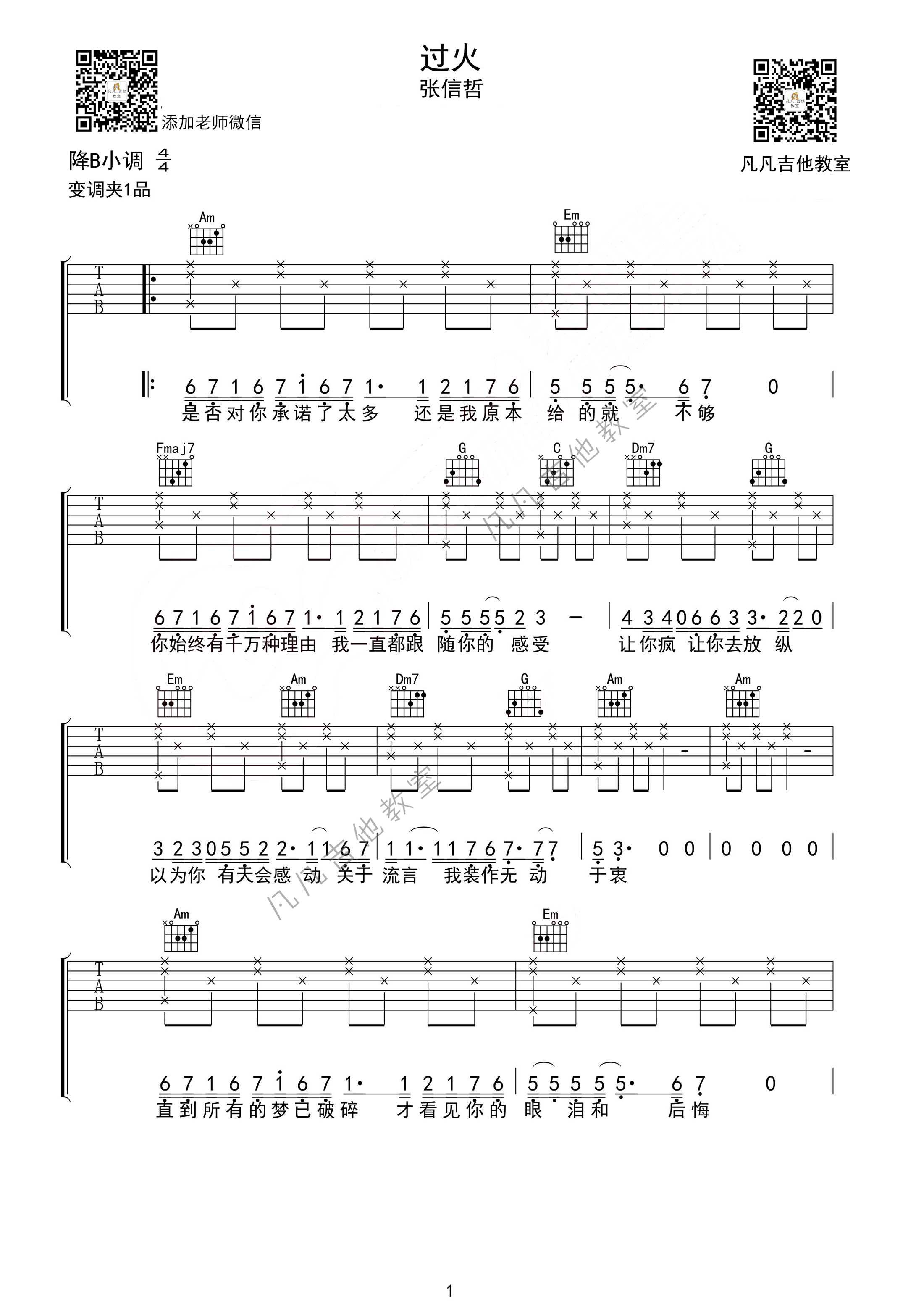 曲谱介绍: 张信哲《过火》吉他弹唱谱,采用B调指法编配,凡凡吉他教室编配出品,共有2张高清图谱,免翻页排版设计。