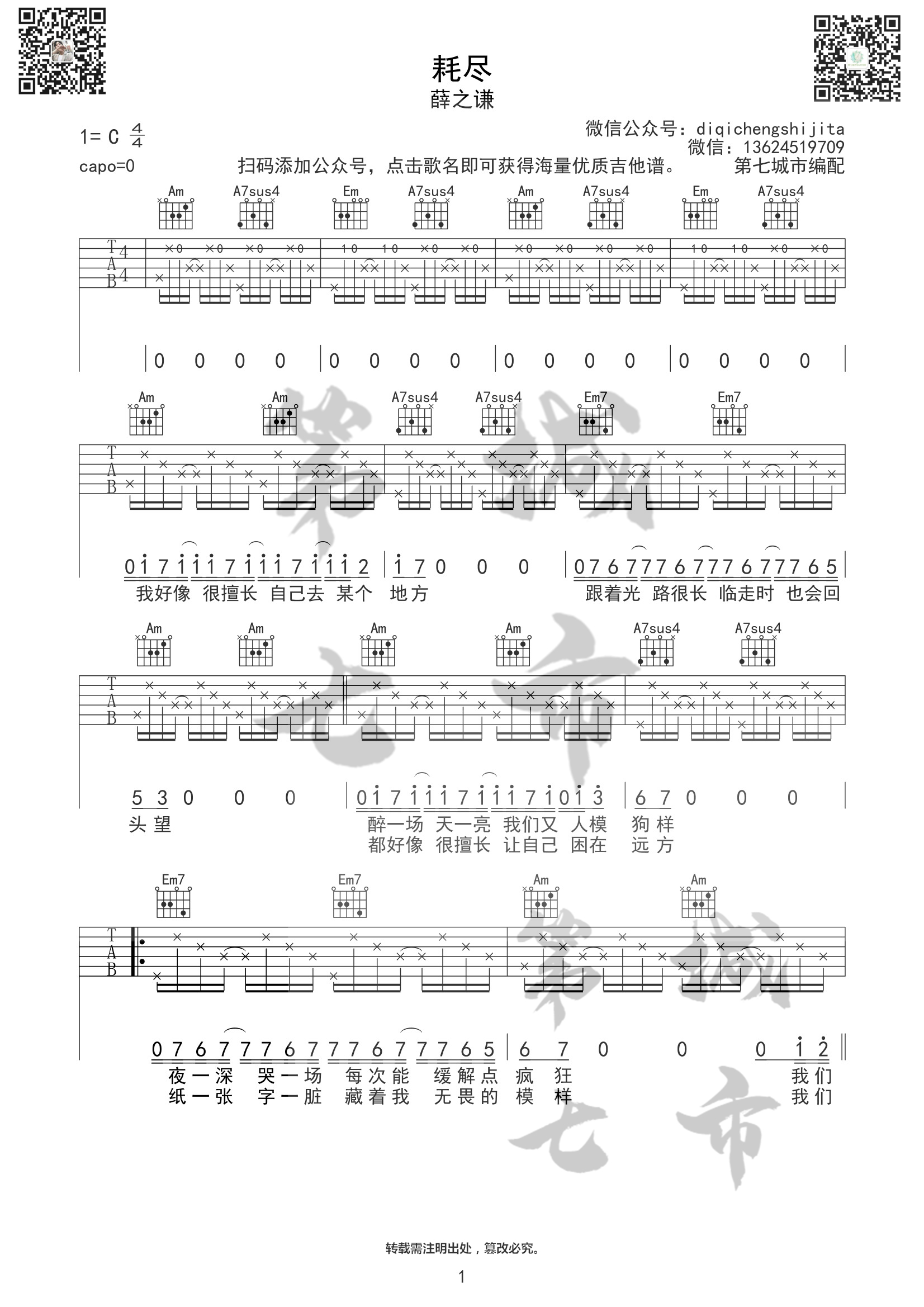 曲谱介绍: 附前奏《耗尽》吉他弹唱谱,采用C调指法编配,共有3张高清图谱。