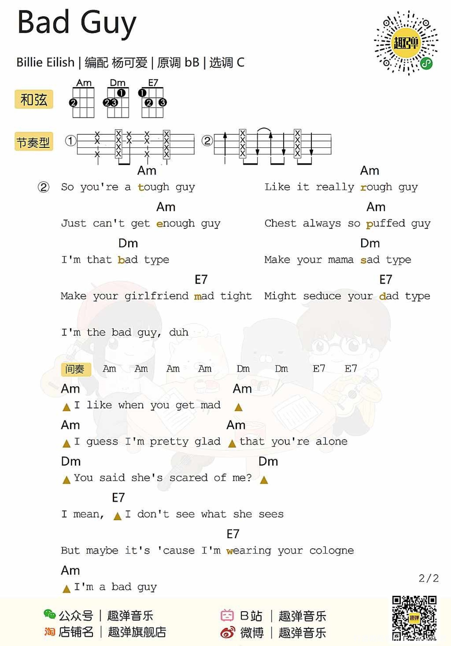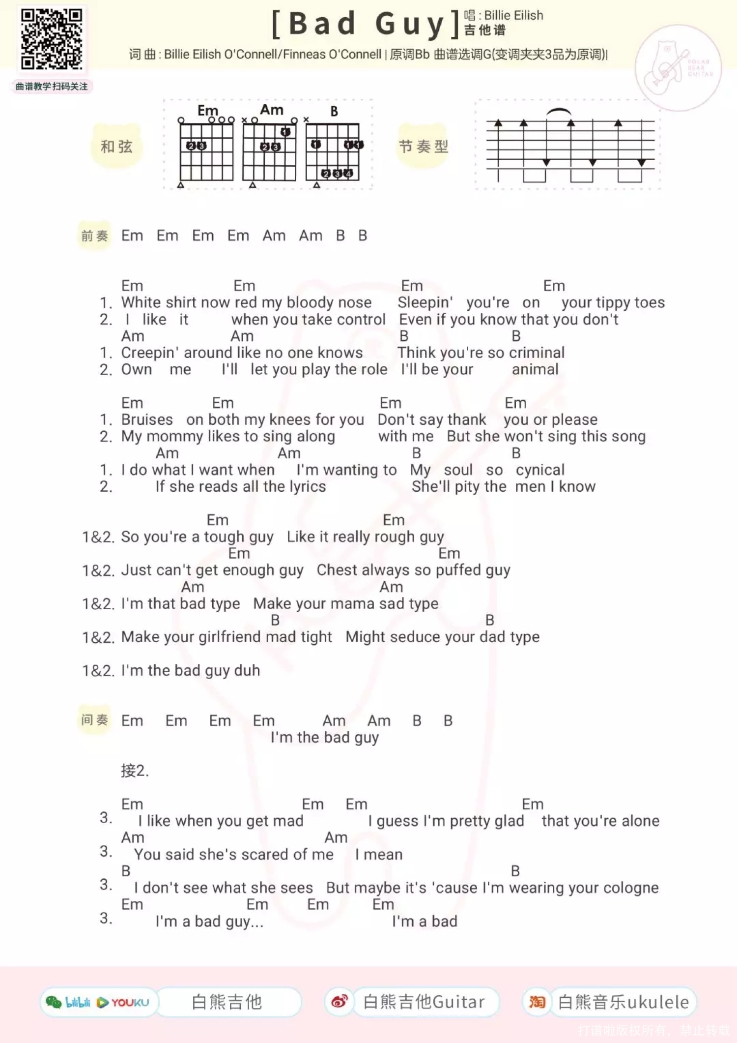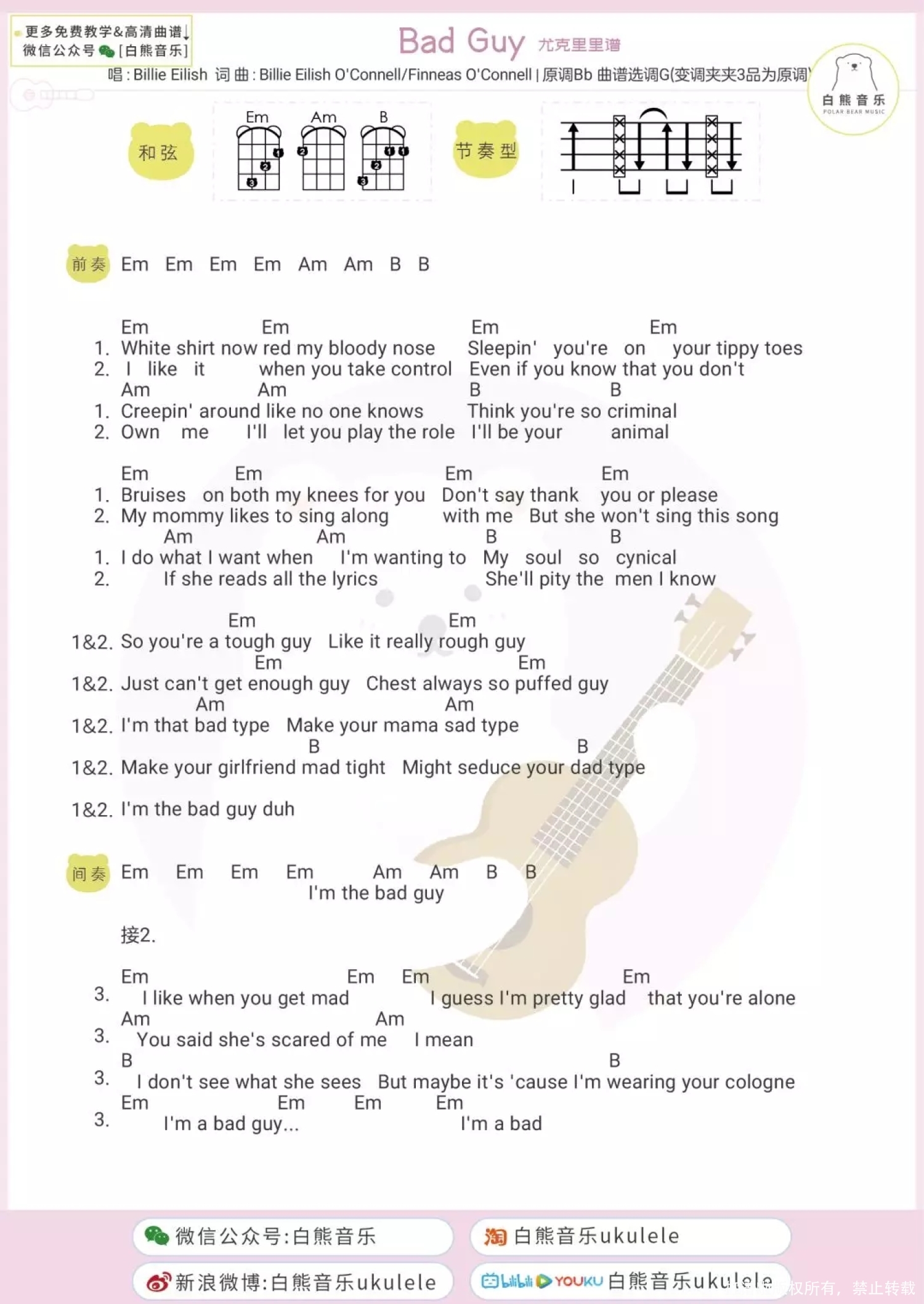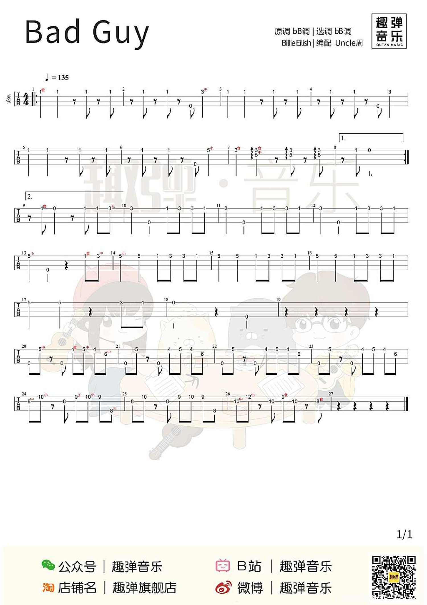 Bad Guy 计算器版 Bad Guy毛线版 Bad Guy 白熊版 目录 bad guy 官方MV Bad Guy尤克里里弹唱 bad guy ukulele弹唱演示 Aloha~ 今天可爱为大家带来的是 17岁天才少女Billie的「Bad Guy」 这是一首非常魔性可爱的一首歌 发布两个月,油管播放量已超2亿 也让Billie很快火遍全球 第一遍听可能并不一定会喜欢 但是多听几遍马上就真香了! 敢问有多少人没有和视频中 可爱一家人一起摇摆脑袋呢 反正趣酱是控制不住自己了_(:з」∠)_ 这家人为什么突然变成了这个亚子? 因为他们偷吃了黑摸仙彩石! .... 开个玩笑 ----------------------------- 说正经的 其实呢 我了解的国外音乐创作者并不多 (惭愧) 我第一次接触碧梨 是因为看到了 一女孩往嘴里放蜘蛛的那个视频 当时的我的心情是 ??? 但又忍不住去搜了更多她的视频 一不留神 就把她大部分的作品都看了 作为一个17岁的孩子 她真的很优秀了 整首歌只用了一个和弦走向 编曲用了一些基本但很动感的配器 加上每个片段不同的音效 组成了一个看似简单 却富有影响力的作品 就是因为这样 让我又背负上了 唱英文歌的重担 录歌的前一周 我每天晚上就拿手机 看破站里的英文教学 一句句的读啊读啊读 万万没想到 唱出来比想象的好一些 这让我感到hin开心 这次的视频是我们从未尝试过的 船新风格 如果大家喜欢它的话 可以到小破站(B站)鼓励鼓励我 给我个痛快的一键三连鸭! Bad guy ukulele弹唱教学 Bad Guy ukulele谱 C调 Bad Guy尤克里里指弹 Bad Guy丨指弹演示 Aloha~ 最近这首「Bad Guy」 真的是深得几位老师的喜爱 不知不觉出了好几个版本的弹奏 今天周叔也为这首歌曲 编配了尤克里里指弹教学 让这首充满节奏感的歌 扫清你的疲惫和慵懒! 学会这首超有节奏感的歌曲 抱着尤克里里摇摆吧! Bad Guy ukulele指弹教学 Bad Guy ukulele指弹谱 Bad Guy 计算器版 没想到吧! 我们还有计算器演奏的「Bad Guy」 在上一节的正经音乐课中 石头老师用计算器弹奏过这首歌 “清除”和“归零” 简直就是注入灵魂! 听完浑身舒适! 计算器谱: Bad Guy毛线版 loha~ 正经音乐课又来啦! 上期石头用计算器弹了几首歌 让大家见识到了它不为人知的一面 今天石头老师又带了新的乐器 斥巨资(3块钱)买了几卷毛线 对没错,这次的主题就是 弹个毛线! Bad Guy 白熊版 1、尤克里里弹唱谱 G调 2、bad guy吉他谱