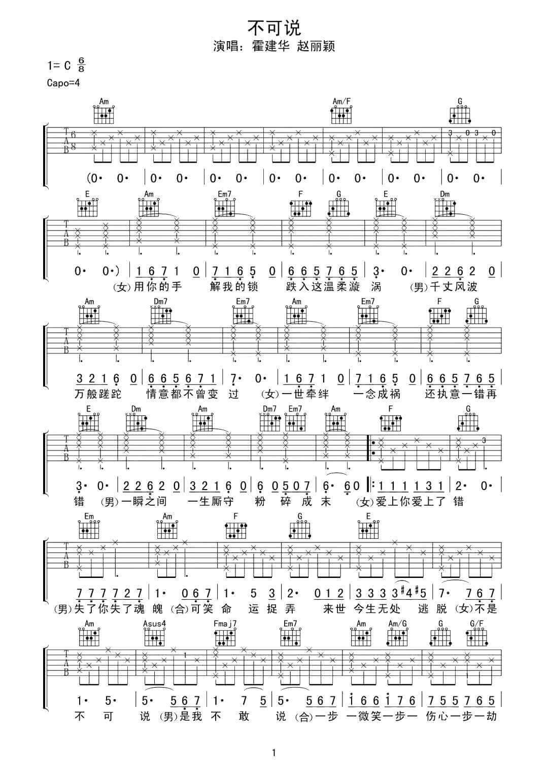 不可说吉他谱 - 霍建华/赵丽颖 - C调吉他弹唱谱