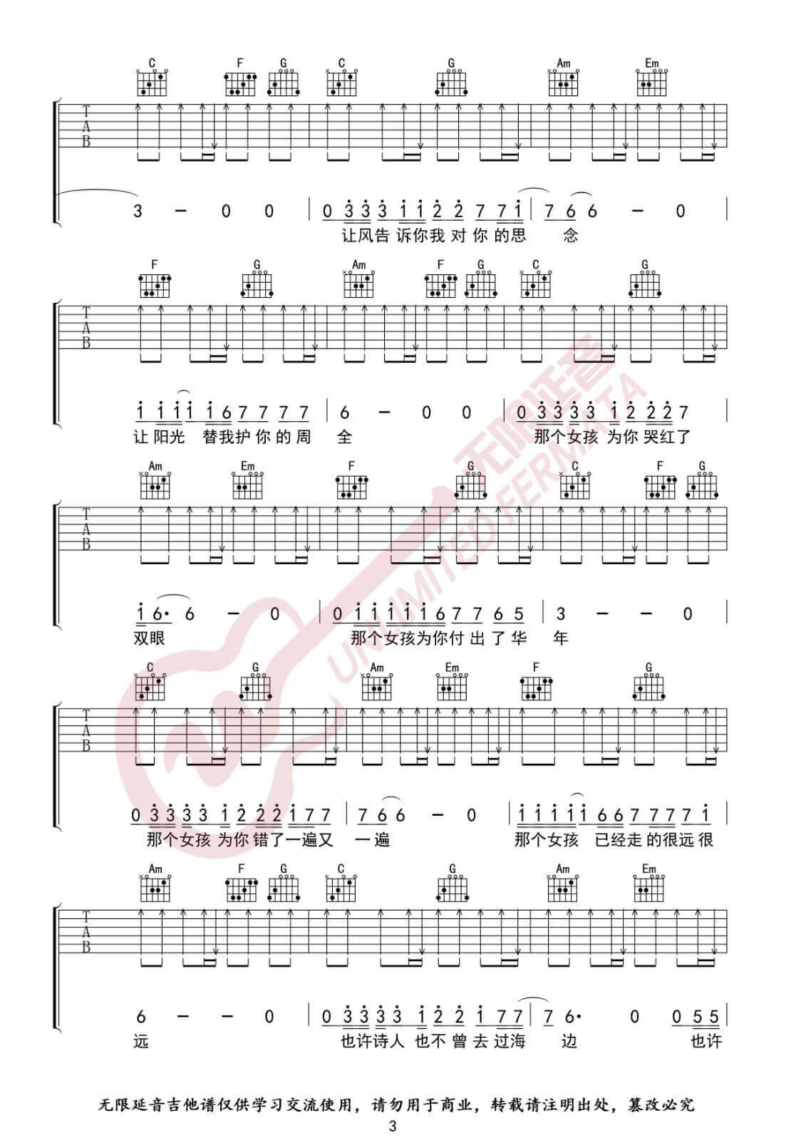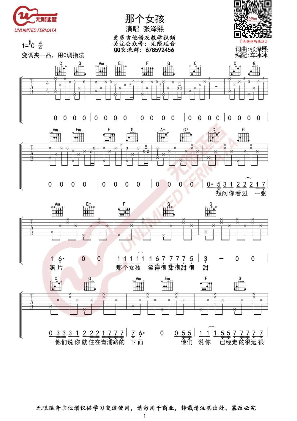 曲谱介绍: 张泽熙《那个女孩》吉他弹唱谱,采用C调指法编配,无限延音编配出品,共有4张高清图谱。