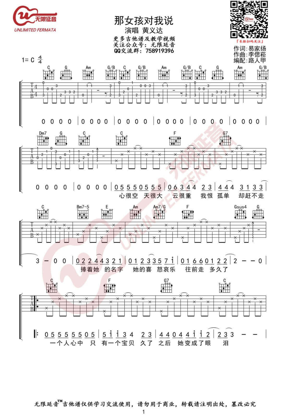 曲谱介绍: 黄义达《那女孩对我说》吉他弹唱谱,采用C调指法编配,无限延音编配出品,共有3张高清图谱。