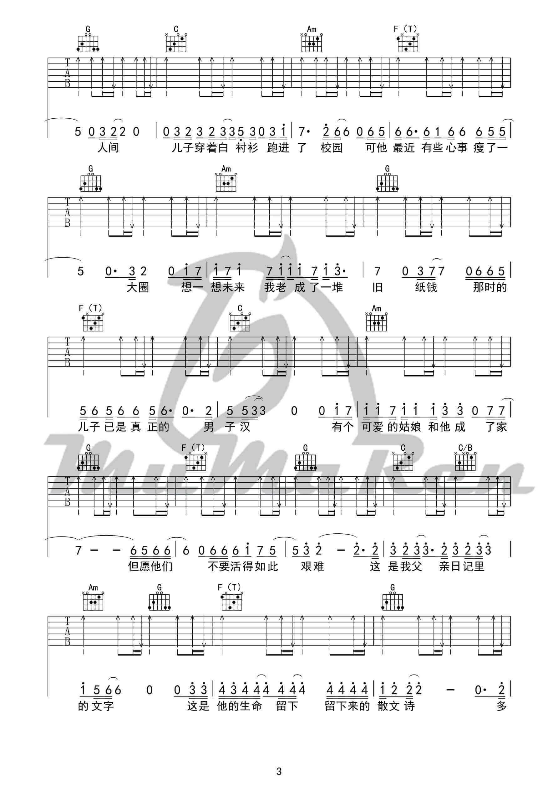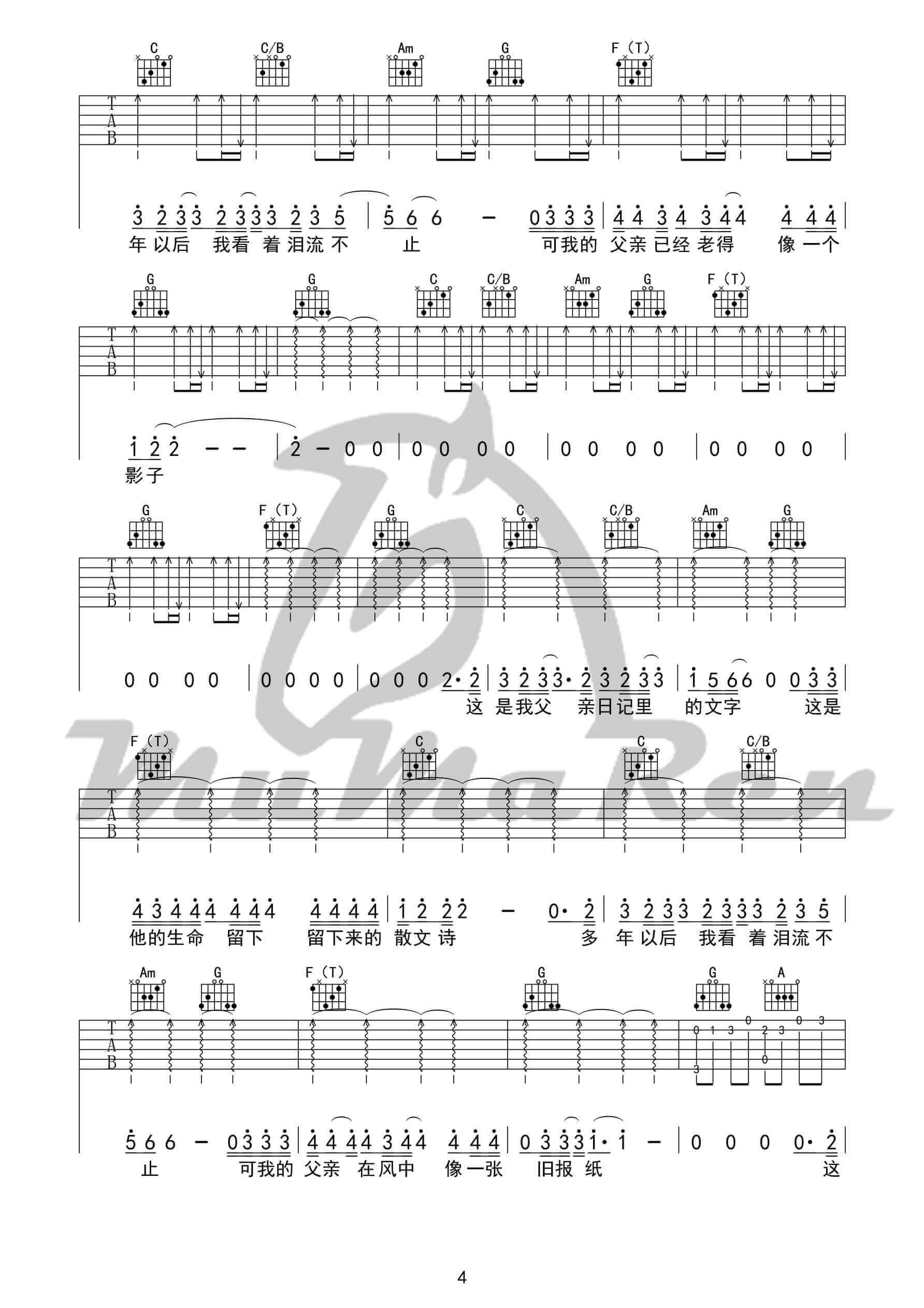 曲谱介绍: 李健《父亲写的散文诗》吉他弹唱谱,采用C调指法编配,牧马人乐器编配出品,共有5张高清图谱。