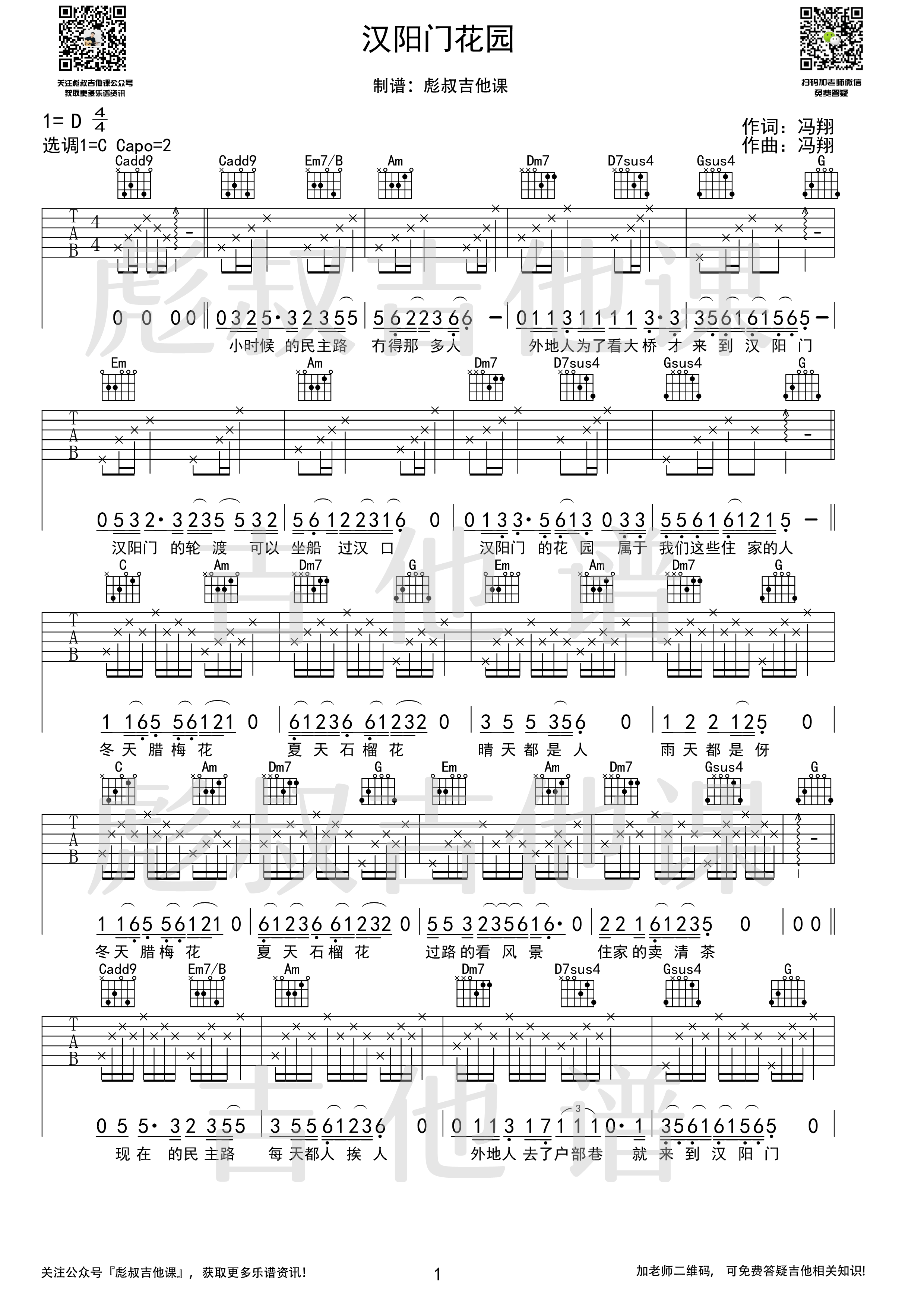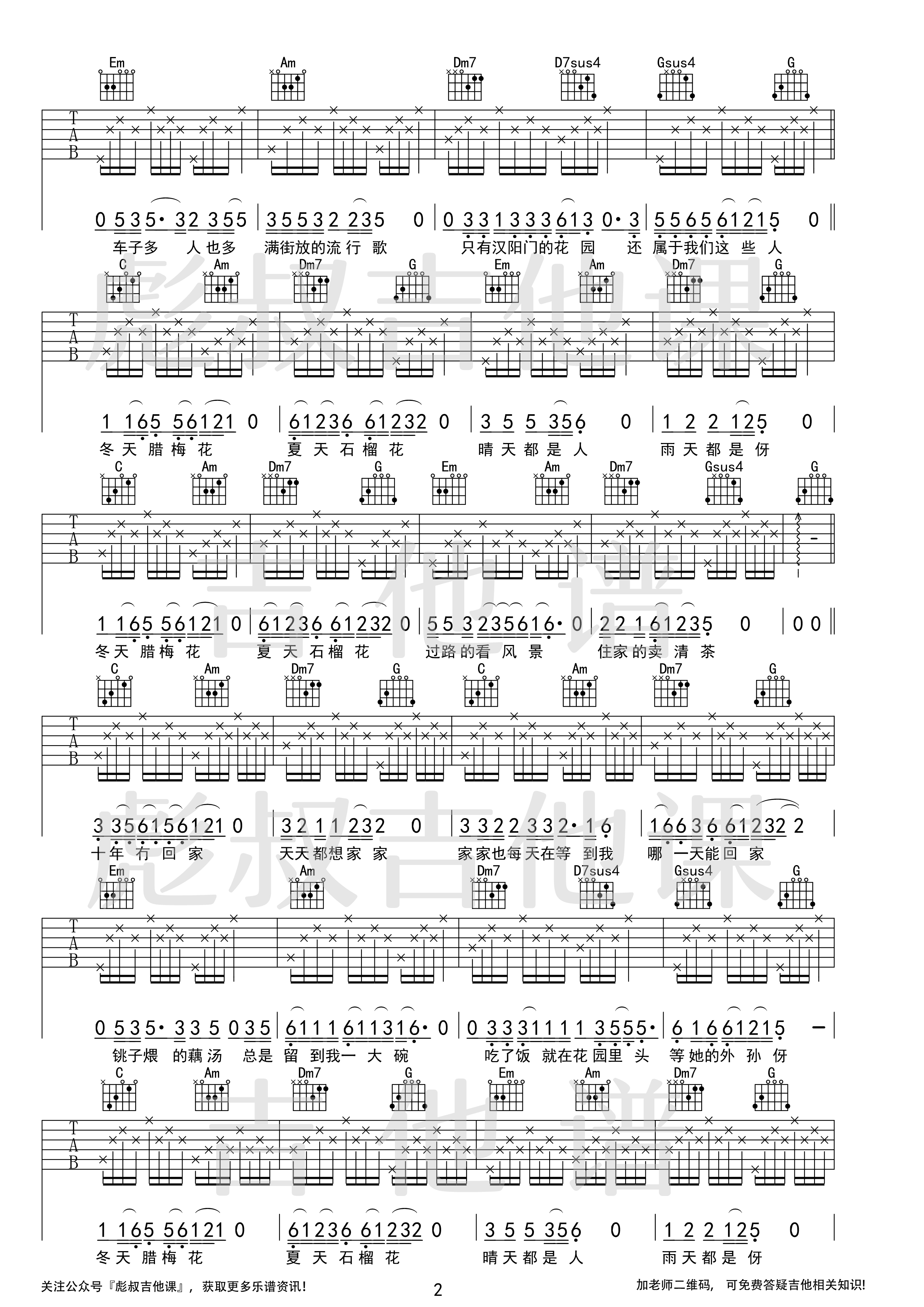 曲谱介绍: 《汉阳门花园(C调六线》吉他弹唱谱,采用C调指法编配,共有2张高清图谱,免翻页排版设计。