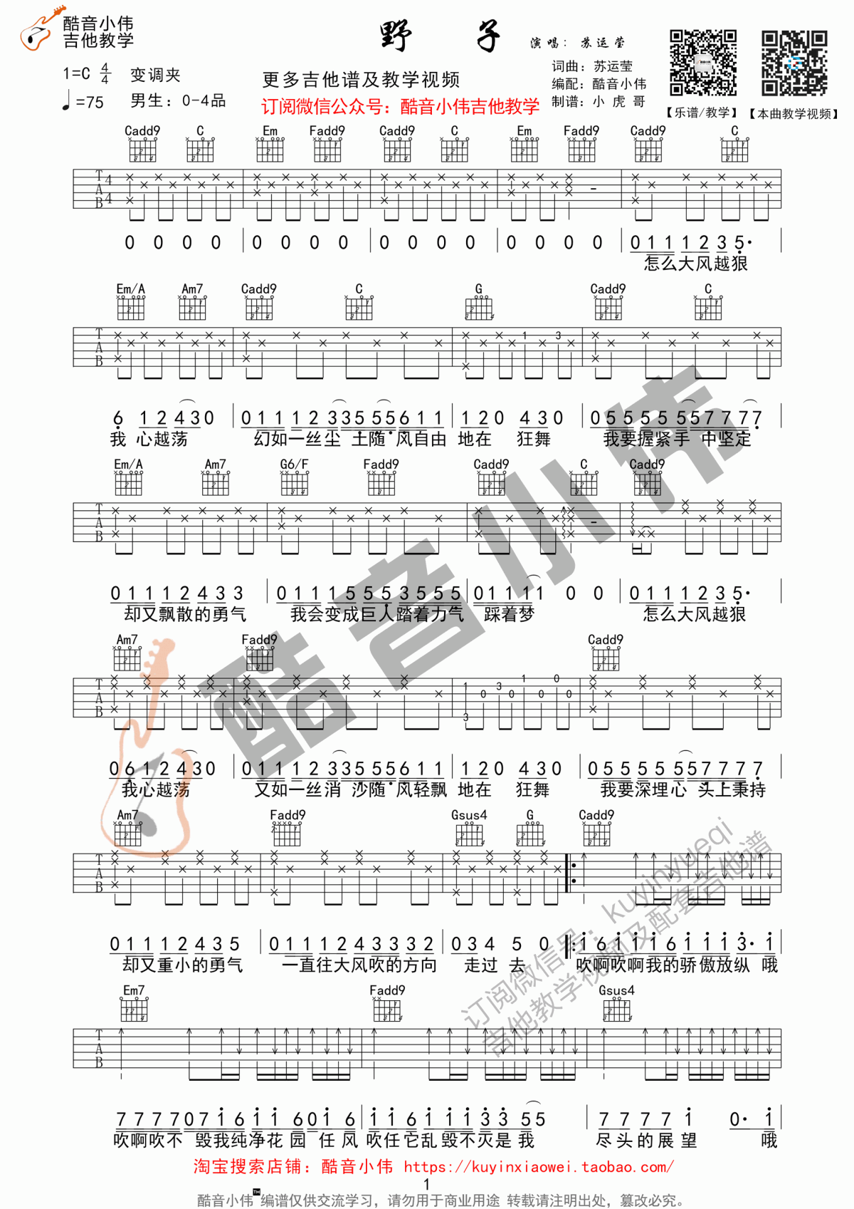 曲谱介绍: 野子吉他谱,本曲谱为C调指法,男生可以根据自己音域选择变调夹。中文好歌苏运莹的原曲、Noko的吉他谱、六行谱高清版两张图片,感谢酷小伟的编译与分享,整首歌是按照原版编译的,伴奏音质完美呈现,节奏类型相对比较简单来说,演奏注意的具体困难是指教师的吉他教学视频。&