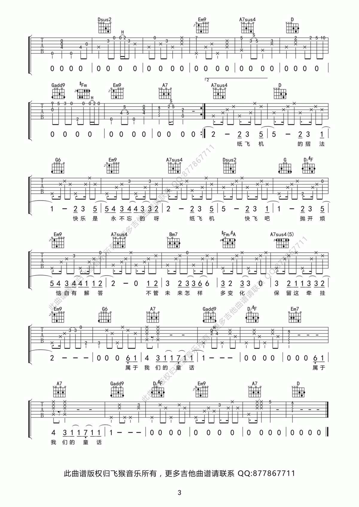曲谱介绍: 林忆莲《纸飞机》吉他弹唱谱,采用D调指法编配,共有3张高清图谱。