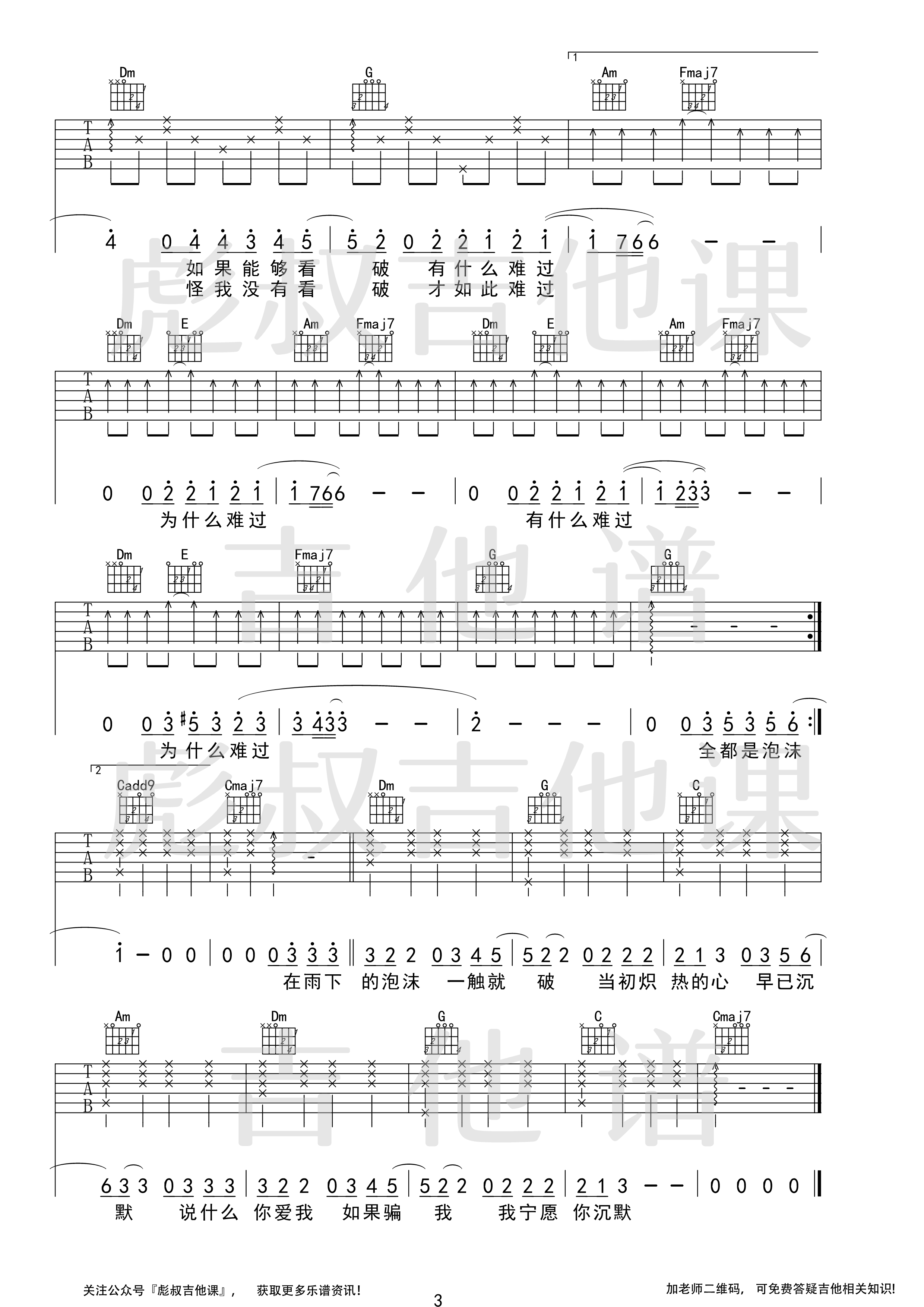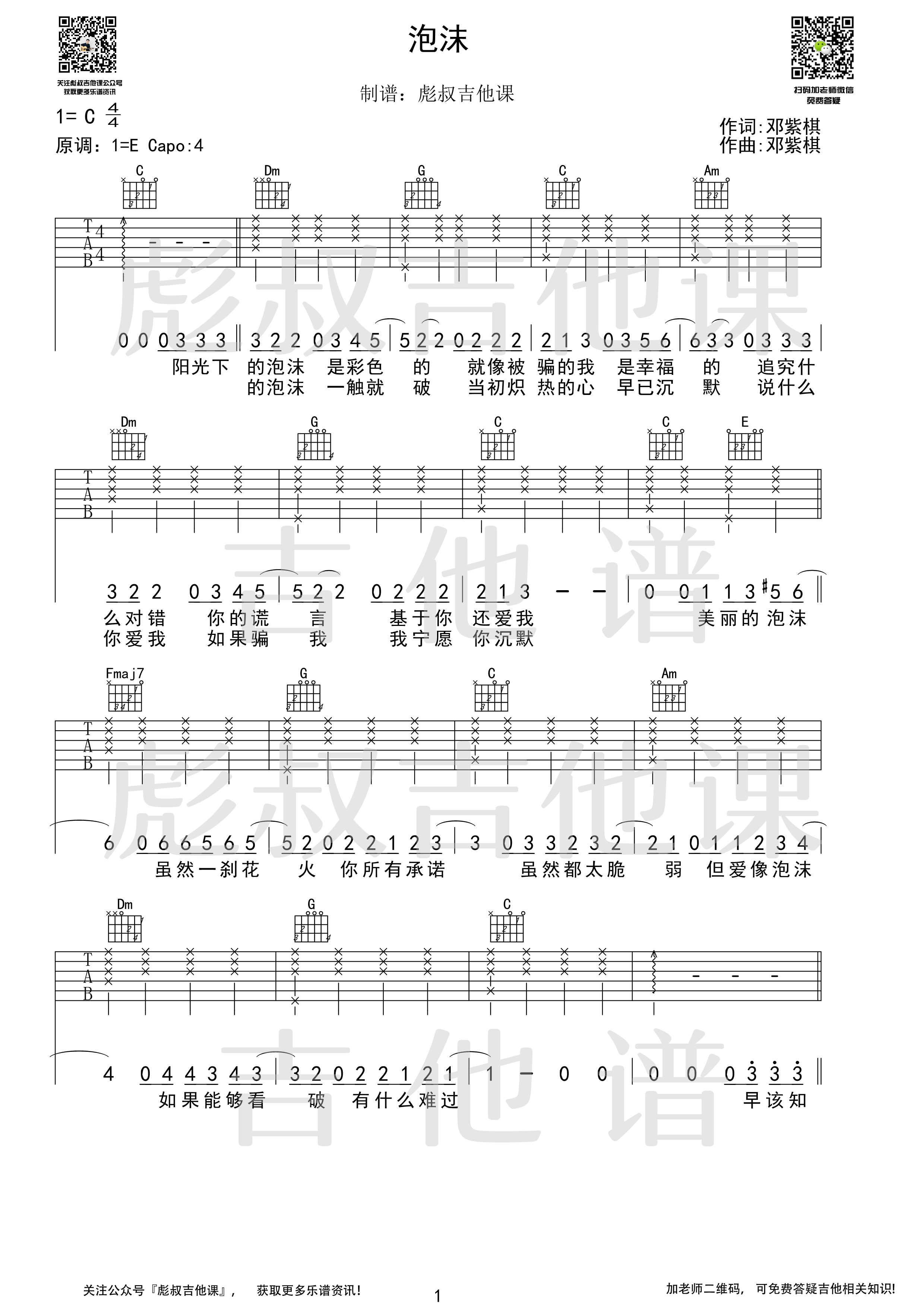 曲谱介绍: 《泡沫》吉他谱,邓紫棋演唱的一首代表歌曲,原调E选调C,Capo夹四品。泡沫六线谱,高清弹唱图片谱共三张谱例。彪叔吉他课编配出品。
