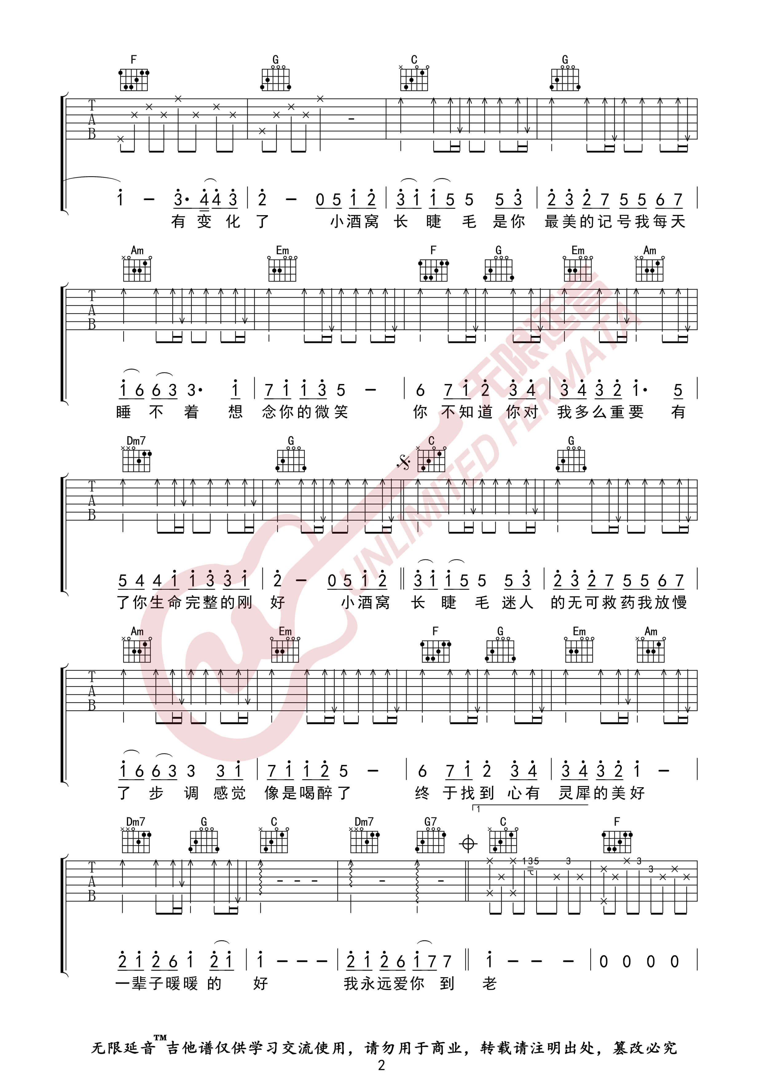 曲谱介绍: 小酒窝吉他谱,林俊杰和蔡卓妍演唱, 一首经典的男女对唱情歌。小酒窝吉他弹唱谱,三张图片六线谱。歌曲采用C调指法编配,变调夹三品,无限延音制谱分享。