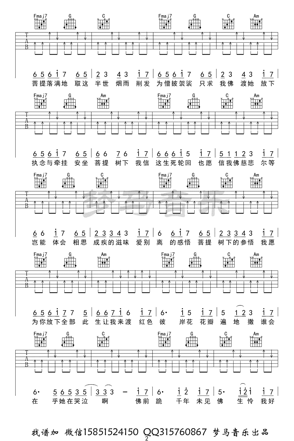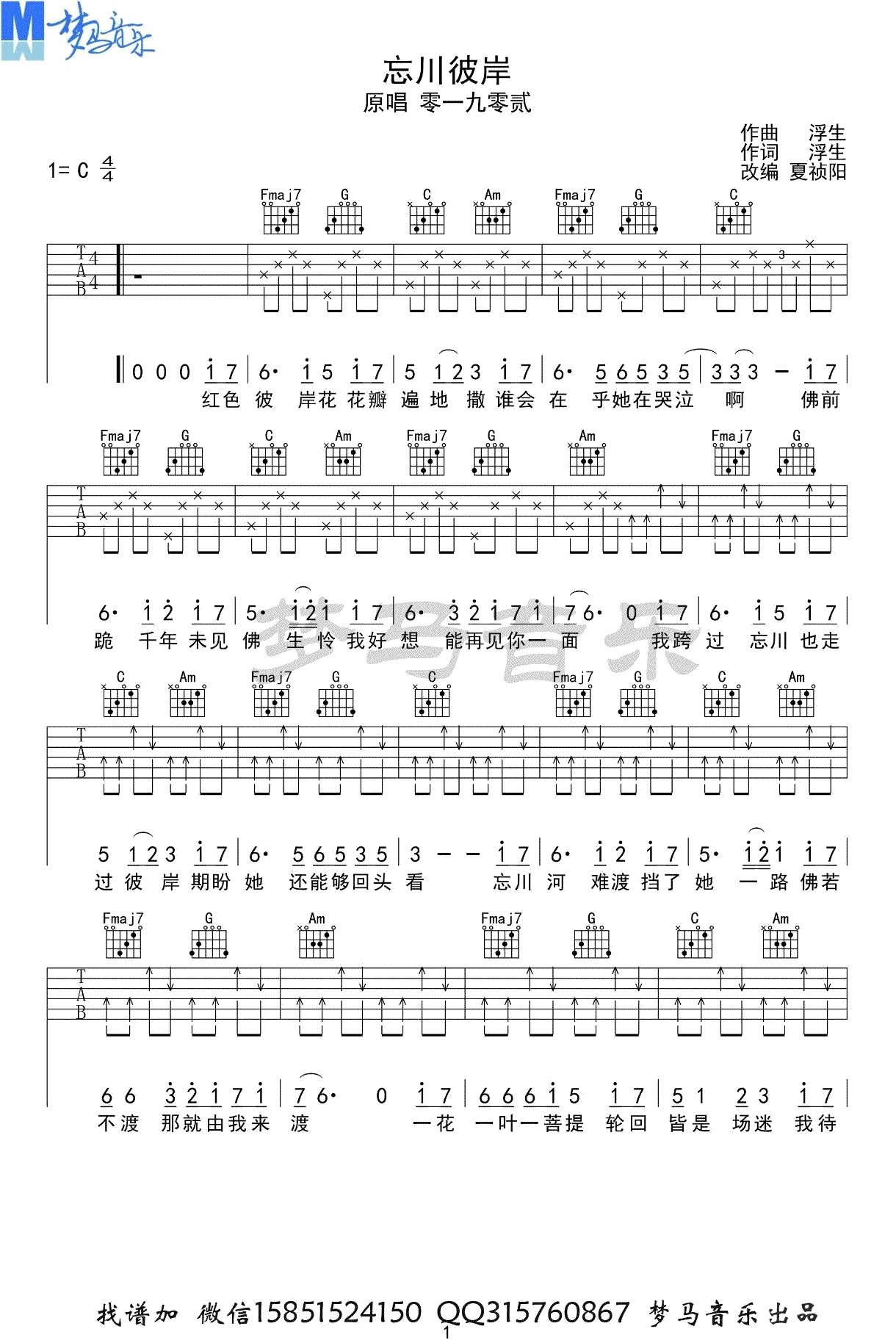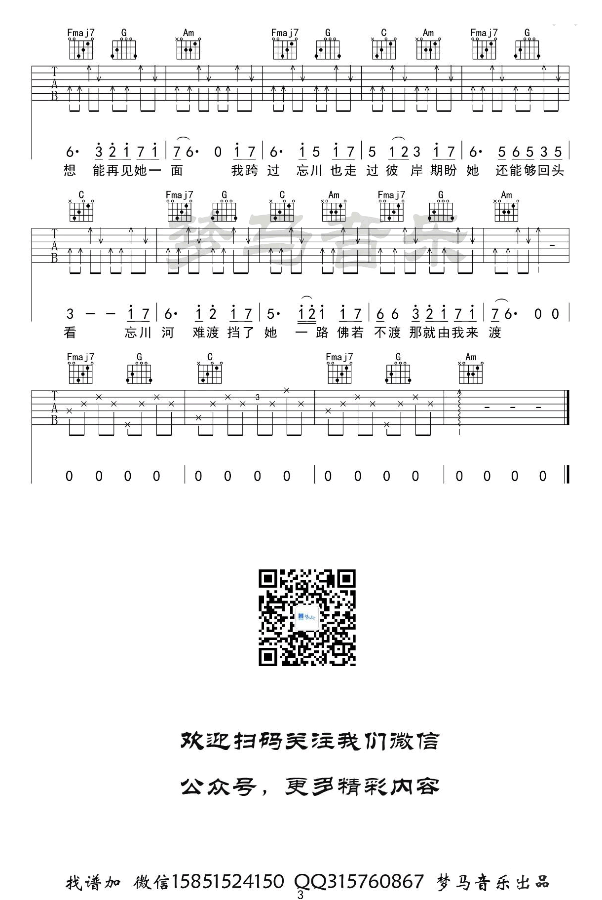 曲谱介绍: 《忘川彼岸》吉他谱。零一九零贰演唱,一首抖音热门歌曲。忘川彼岸C调简单版,弹唱六线谱共三张图片。梦马音乐出品。