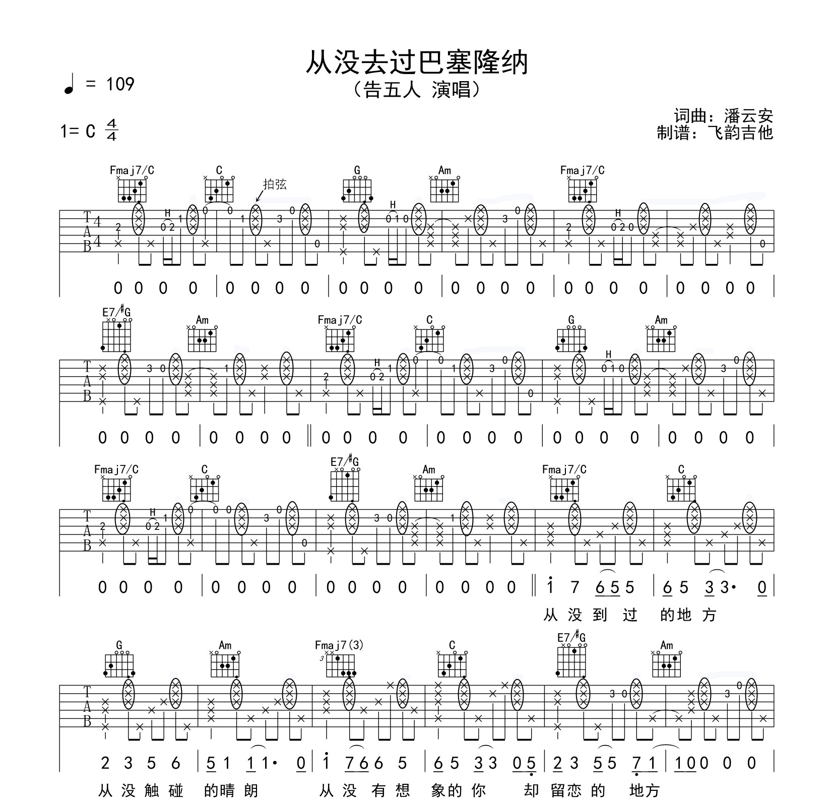 曲谱介绍: 告五人《从没去过巴塞隆纳》吉他谱,选用C调指法,拍弦节奏,根据嗓音调整变调夹位置,速度109BPM,速度4/4拍,难度中级,本谱由飞韵吉他制谱。