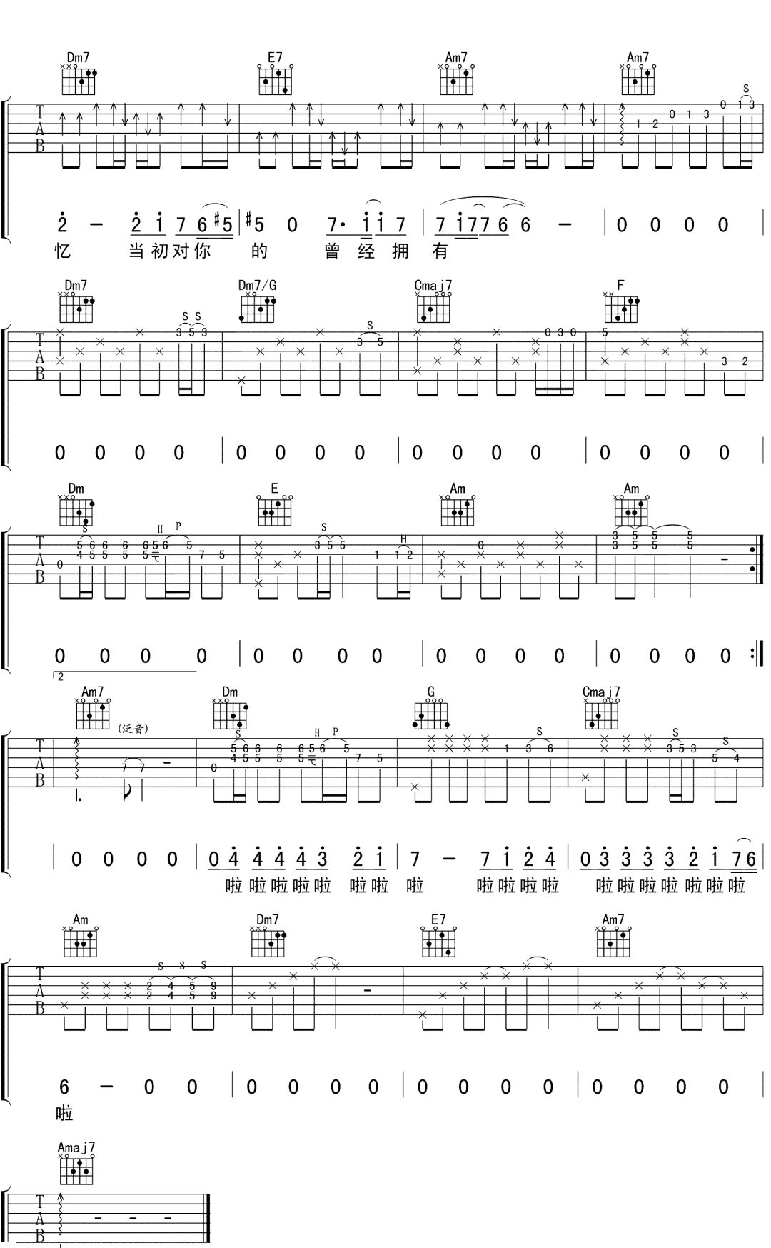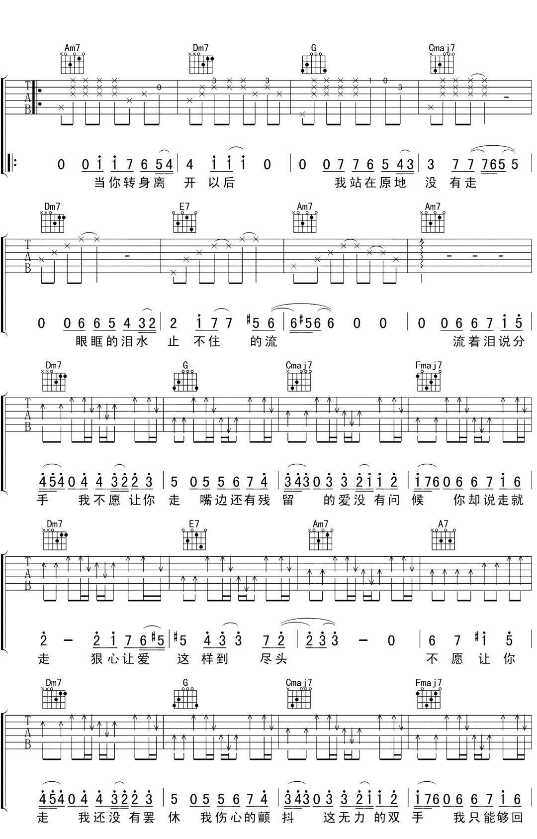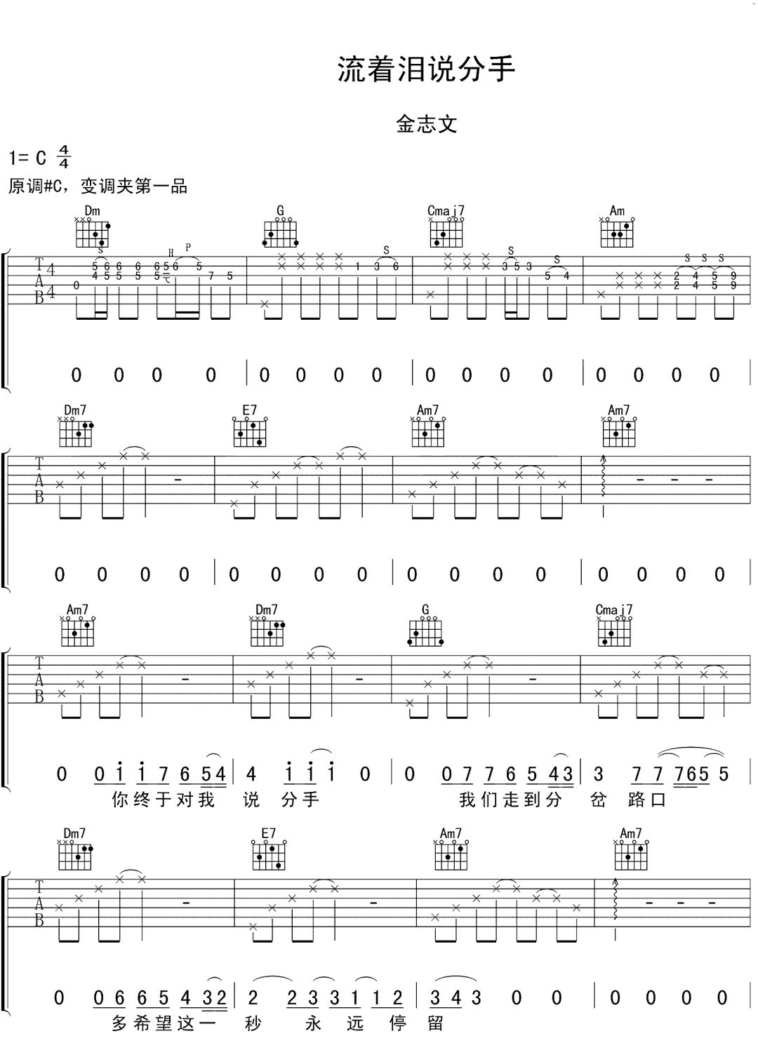 曲谱介绍: 金志文《流着泪说分手》吉他谱,共三张高清图片谱,选用C调,变调建议夹一品弹唱原调,含完整前奏按原版编配,弹唱难度初级简单。