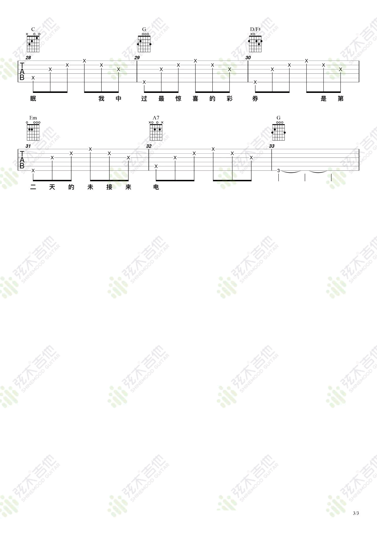曲谱介绍: 《彩券》吉他谱,薛之谦演唱的一首新歌,彩券吉他弹唱谱,原调降G,选用G调,起调音二弦,三张图片谱。