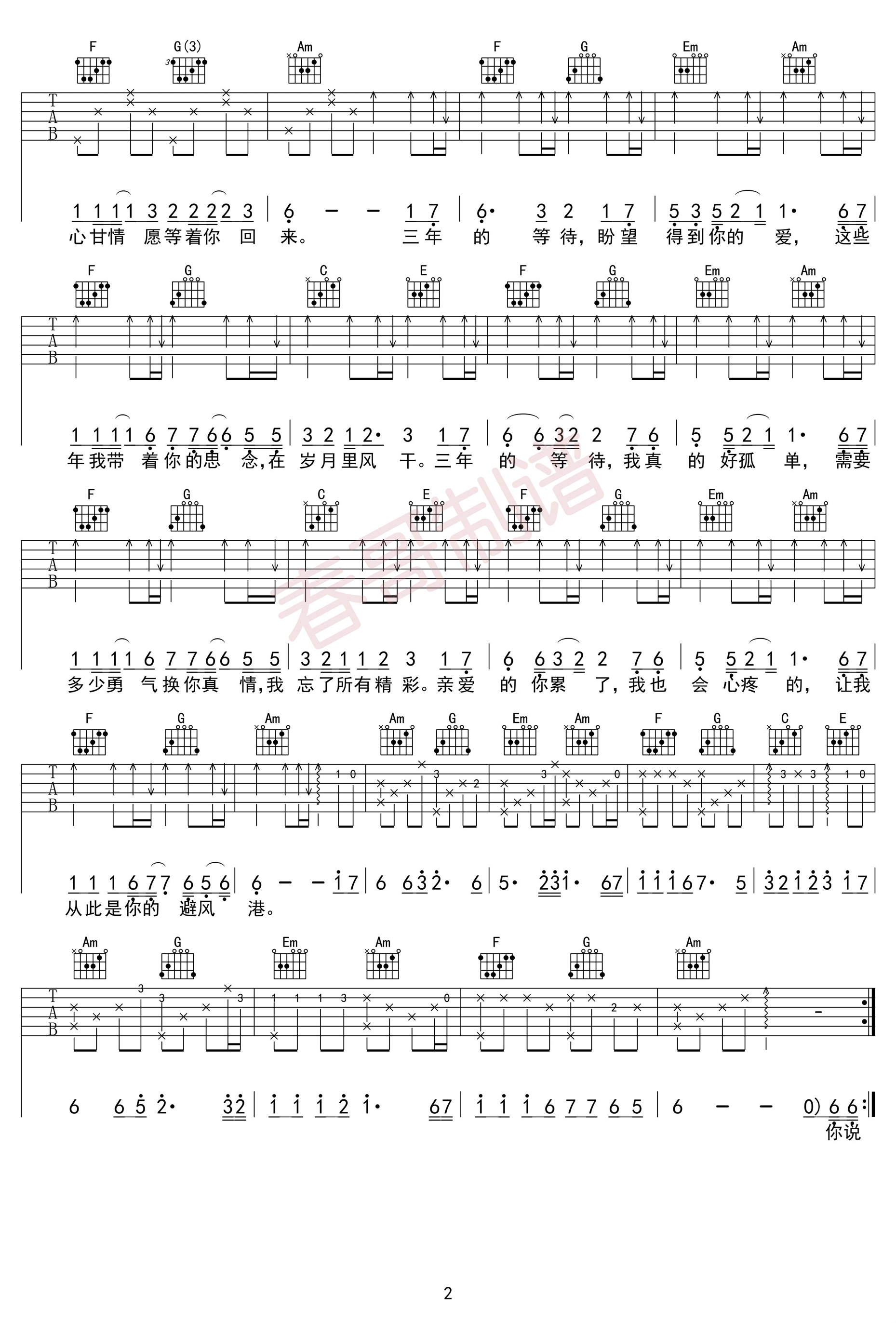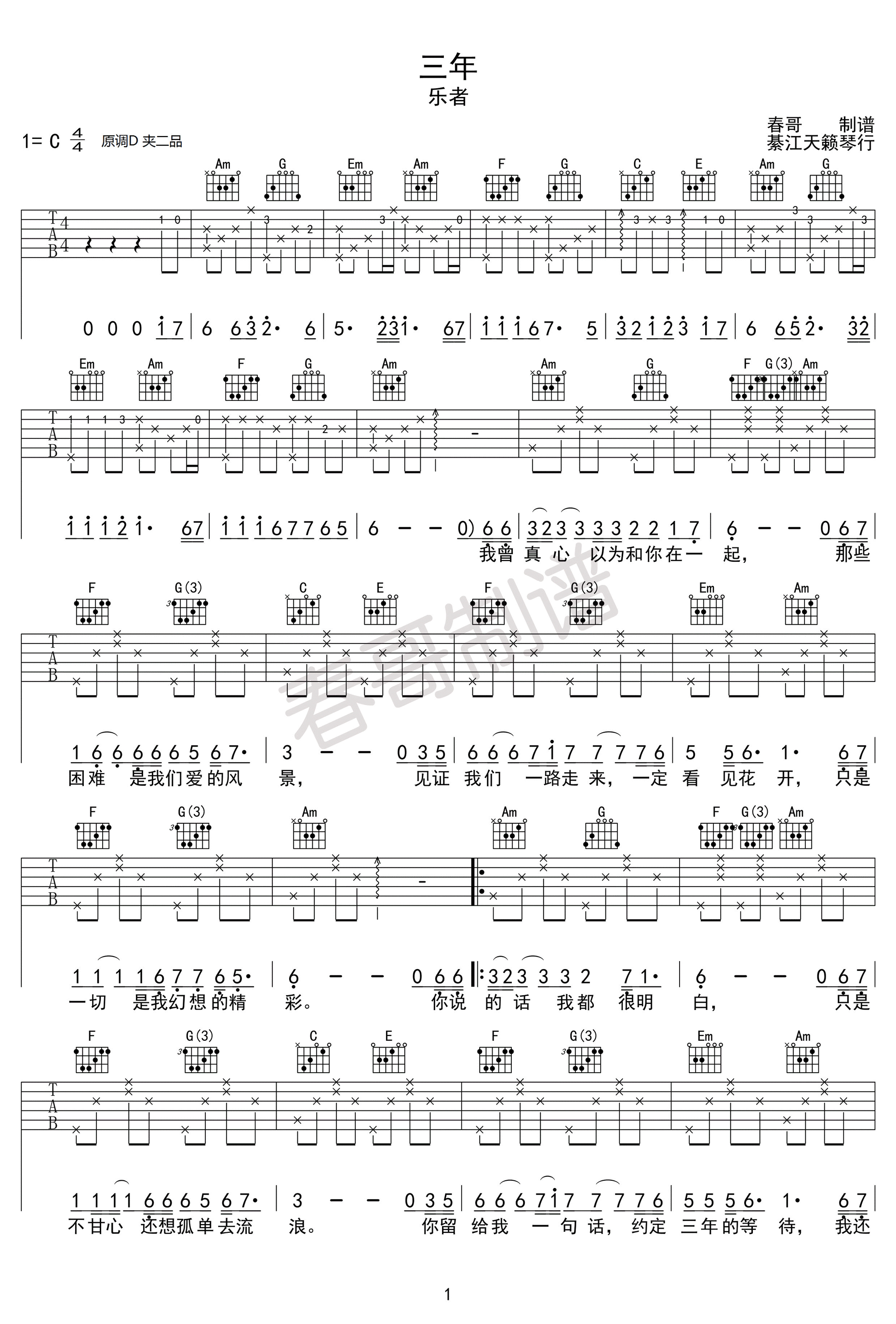 曲谱介绍: 乐者《三年》吉他弹唱谱,采用C调指法编配,天籁琴行编配出品,共有2张高清图谱,免翻页排版设计。