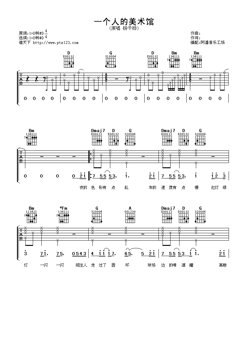 曲谱介绍: 杨千嬅《一个人的美术馆》吉他弹唱谱,采用D调指法编配,阿潘音乐工场编配出品,共有4张高清图谱。