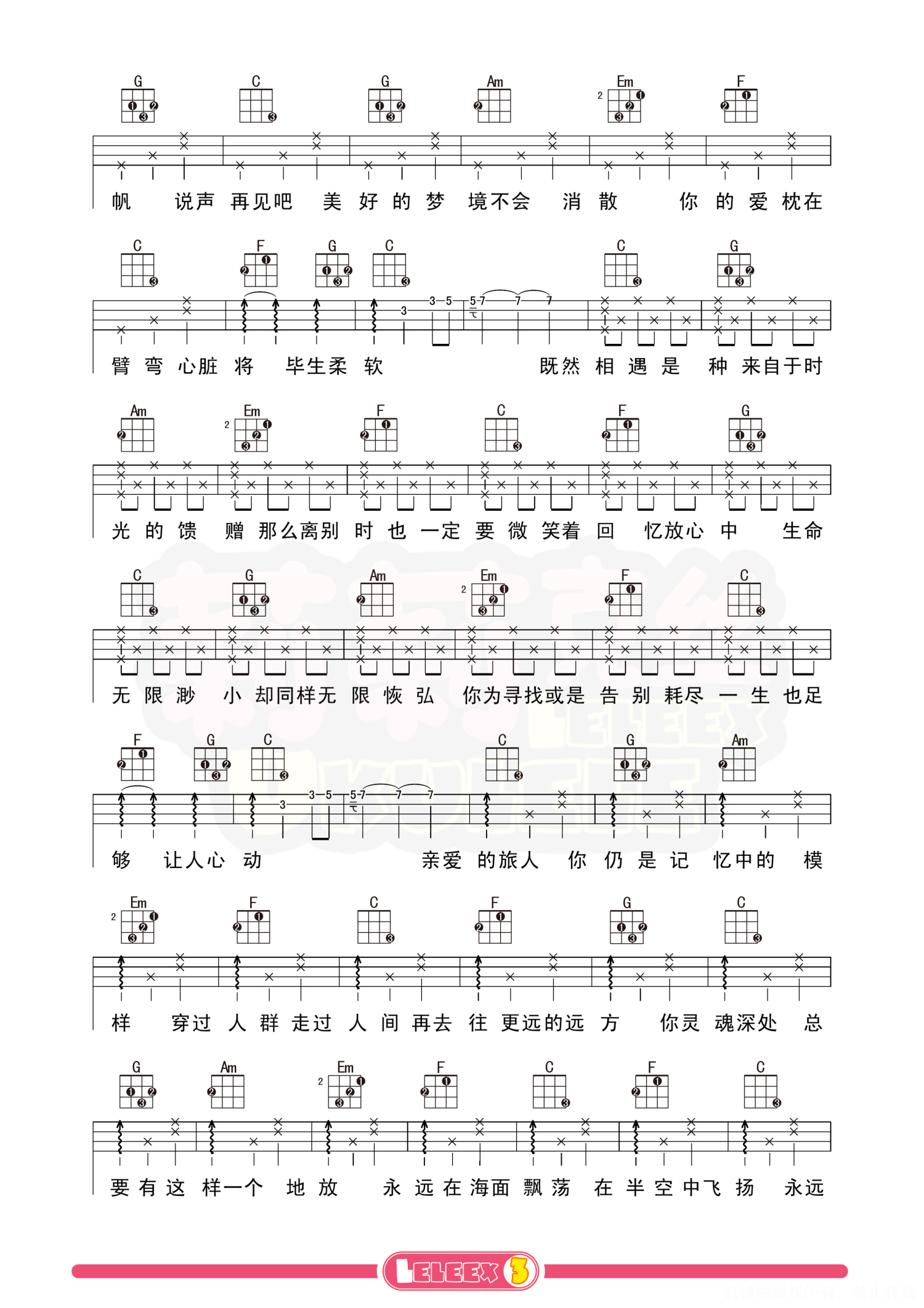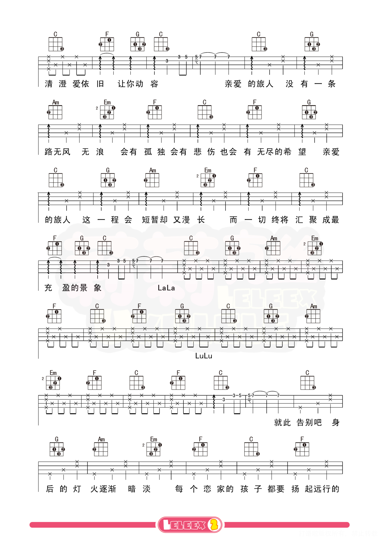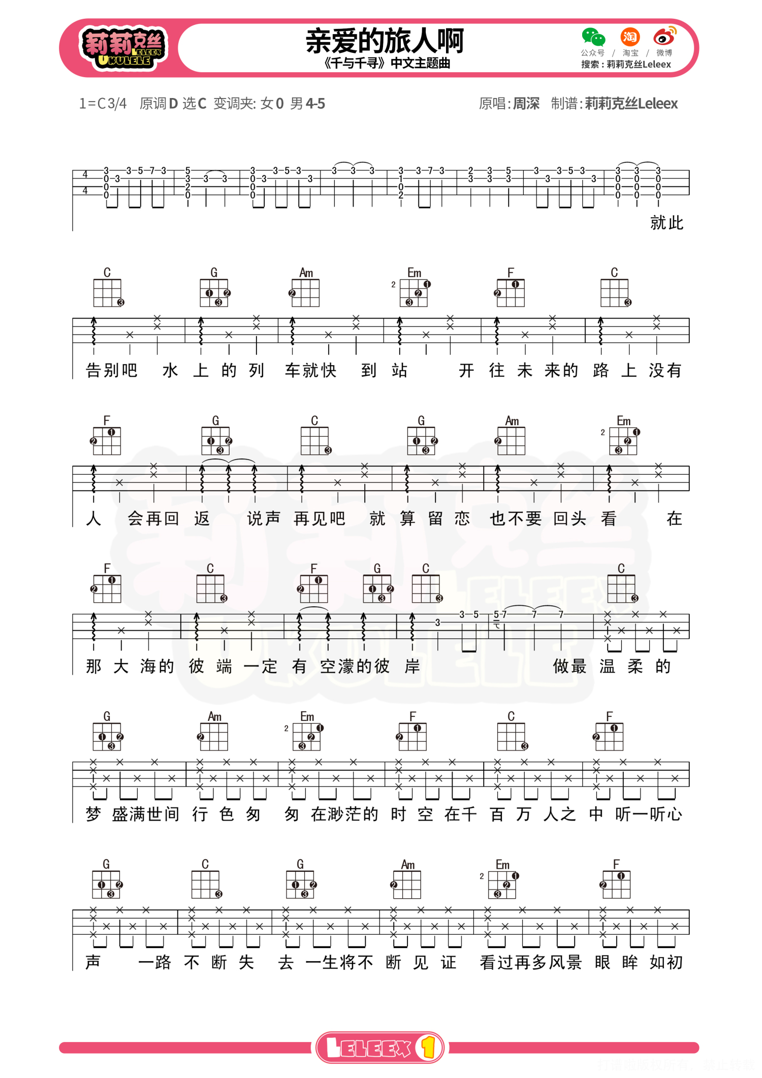 曲谱介绍: 千与千寻主题曲《亲爱的旅人啊》尤克里里曲谱 更多尤克里里曲谱/教学  关注@莉莉克丝Leleex