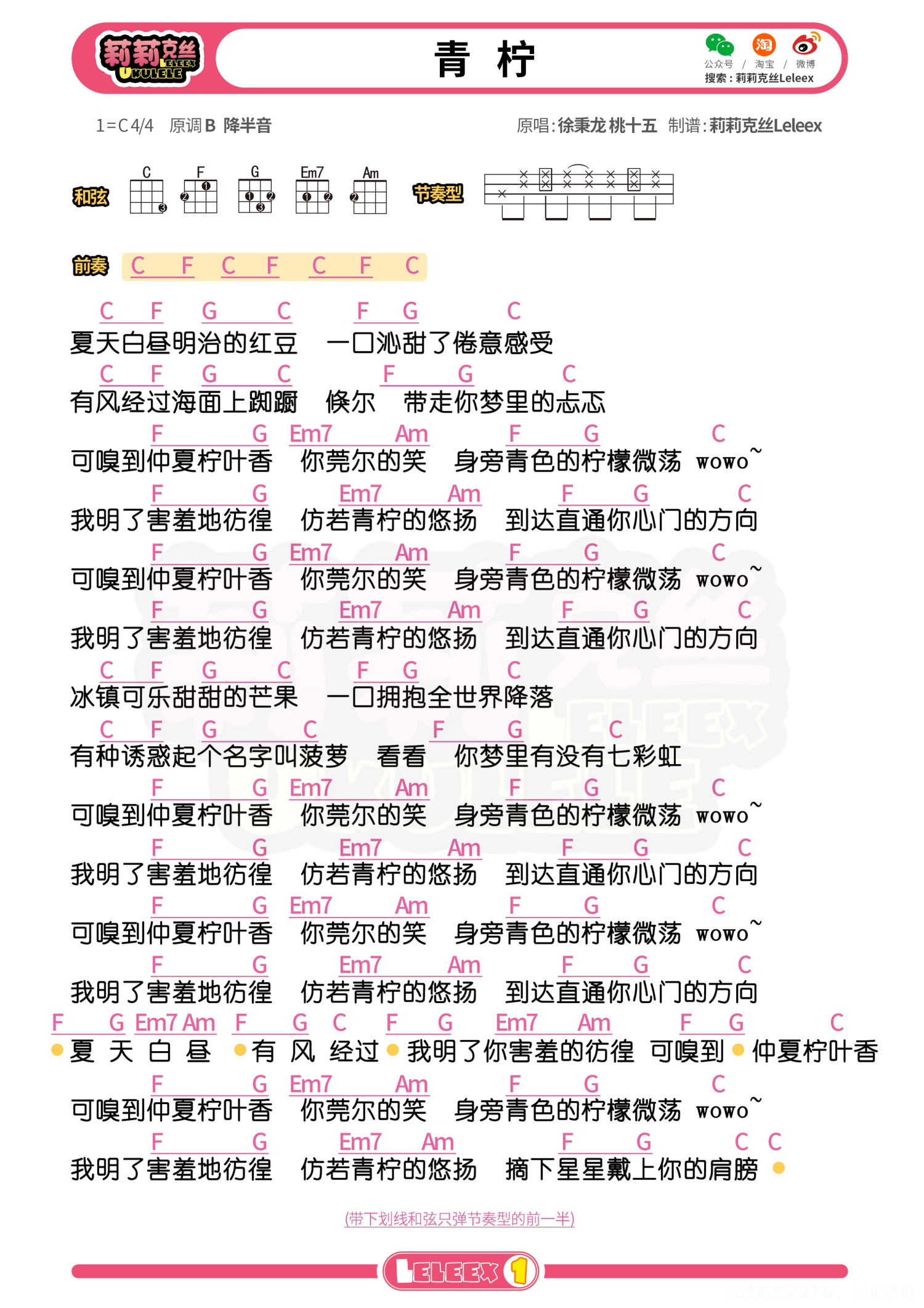 曲谱介绍: 《青柠》尤克里里谱 更多尤克里里曲谱/教学  @莉莉克丝Leleex