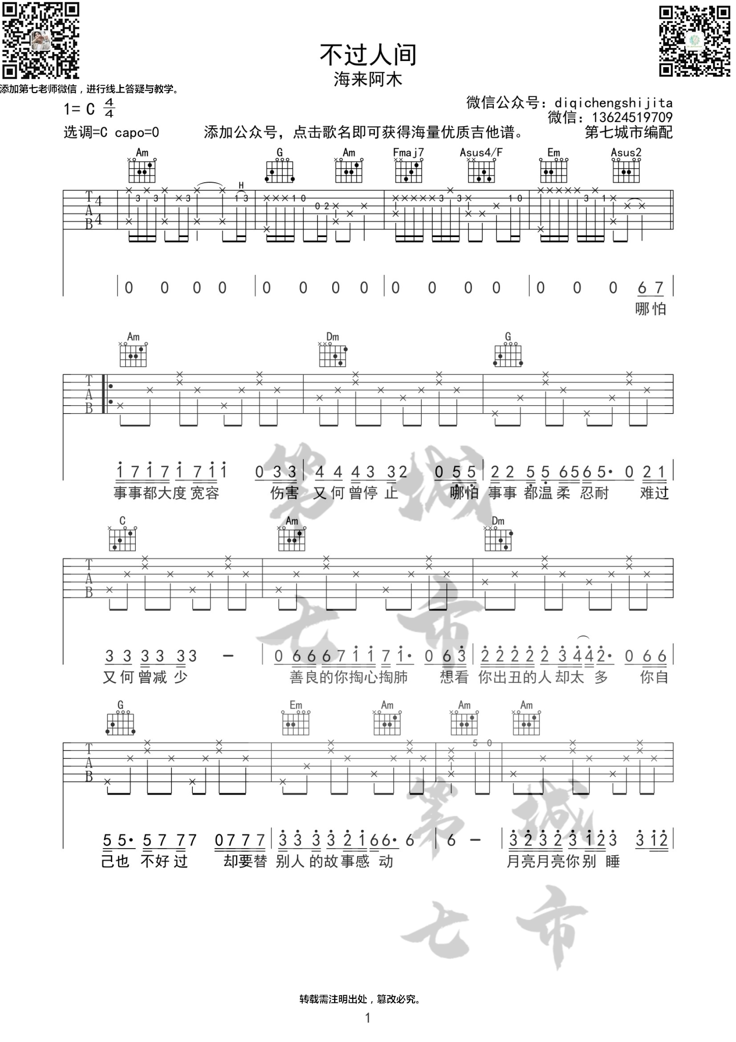 曲谱介绍: 海来阿木《不过人间》吉他弹唱谱,采用C调指法编配,第七城市编配出品,共有4张高清图谱。