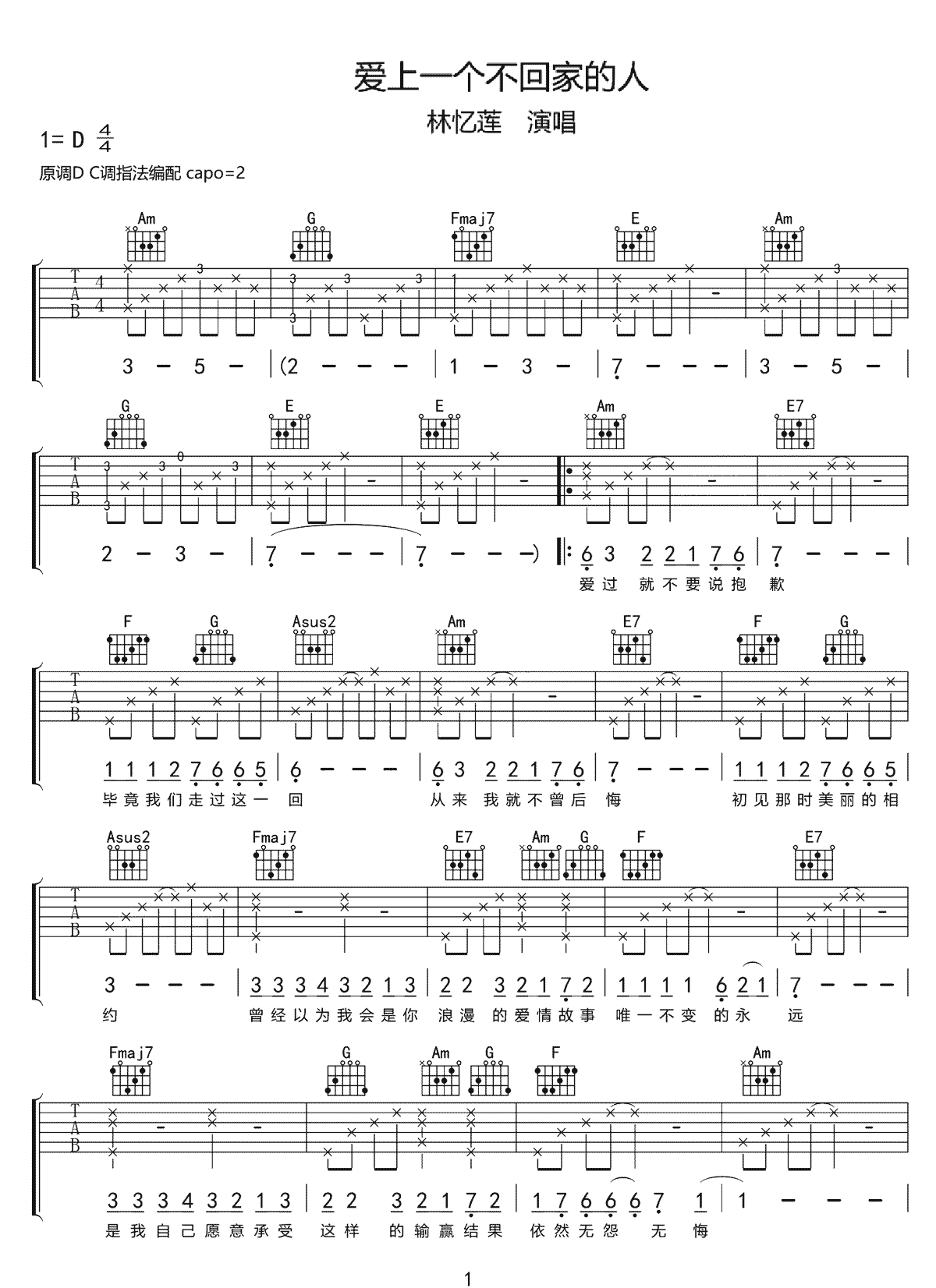 曲谱介绍: 附前奏《爱上一个不回家的人》吉他弹唱谱,采用D调指法编配,共有3张高清图谱。
