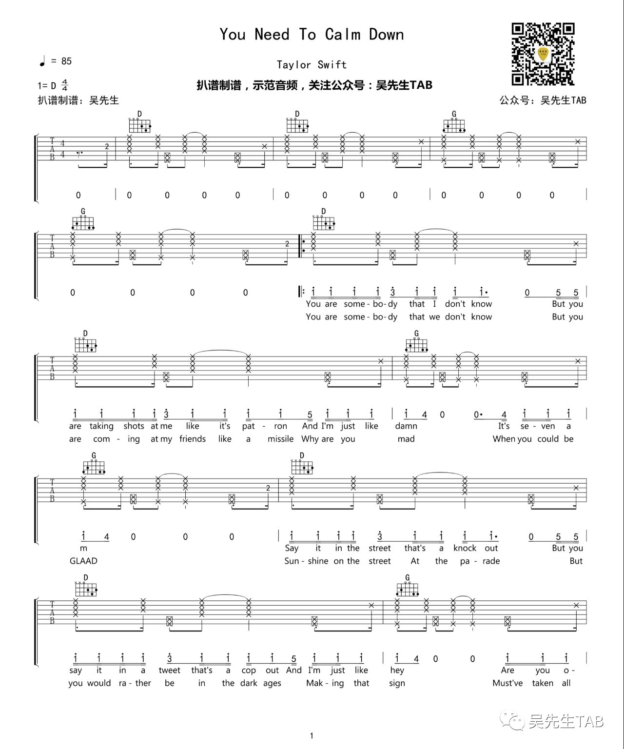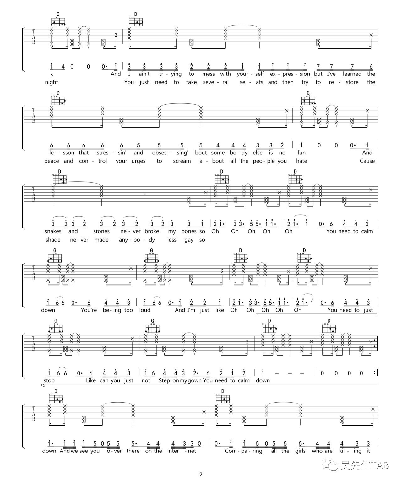 曲谱介绍: You《YouNeedToCalmDown》吉他弹唱谱,采用D调指法编配,吴先生编配出品,共有3张高清图谱。