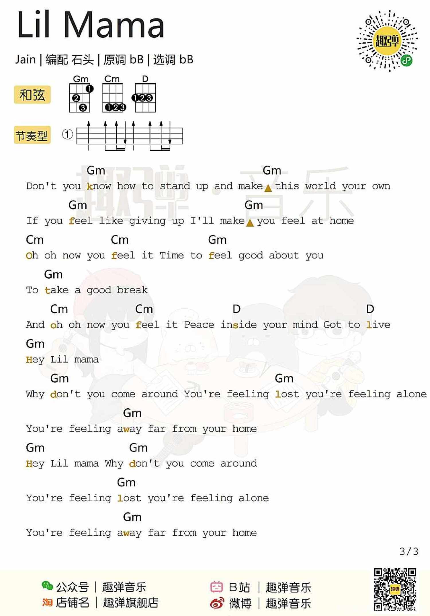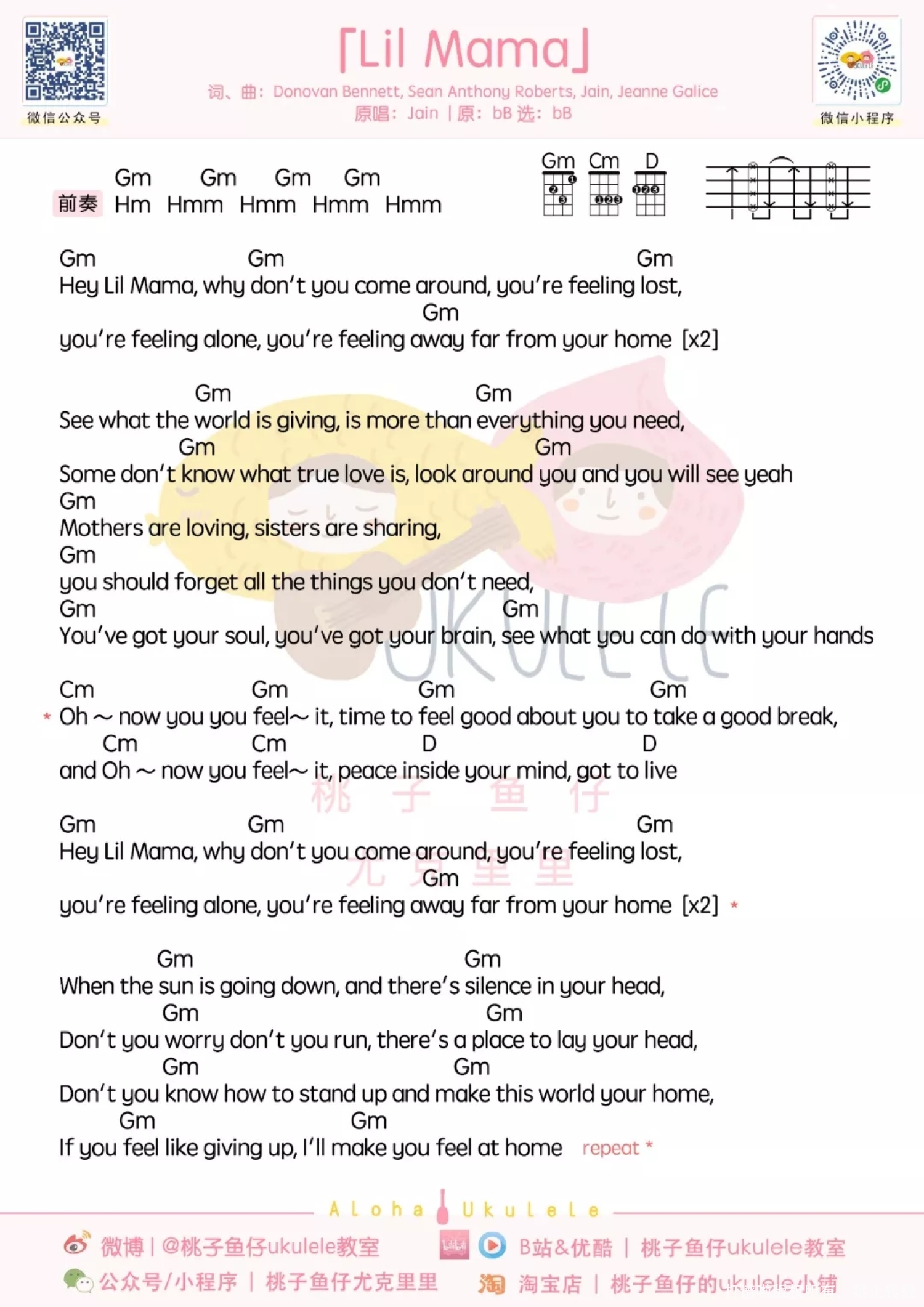 曲谱介绍: Aloha~今天跟大家分享的歌曲是来自 法兰西独立音乐人Jain的「Lil Mama」 这首歌给我的感觉是什么呢? 走在街上听它 我就是整条街腿最长!腰最细! 踩点最准的Model! 逛街的小姐妹答应我! 赶紧听起来!   Lil Mama ukulele谱   桃子版: “ 嘿!李兰妈妈,哇!都去烤梅肉 也不领个老四,也不领个笼,也不领个违法佛么要厚嘿!” 现在唱歌都这么皮的吗! 这几天刷抖音,全都是“嘿李兰妈妈” 请问李兰是谁??? 你妈妈火了 !! 原来这首被神翻译成中文的歌叫做“《Lil Mama》” 不知道肿么回事 网友们硬生生的把这首超硬核英文歌 《Lil Mama》翻唱了“嘿李兰妈妈” 全抖音都是中式英语 我已经忘记原唱是怎么唱的了... 考验中文听力的时刻来了! 各种谐音让人笑到肚子痛~   Lil Mama尤克里里谱