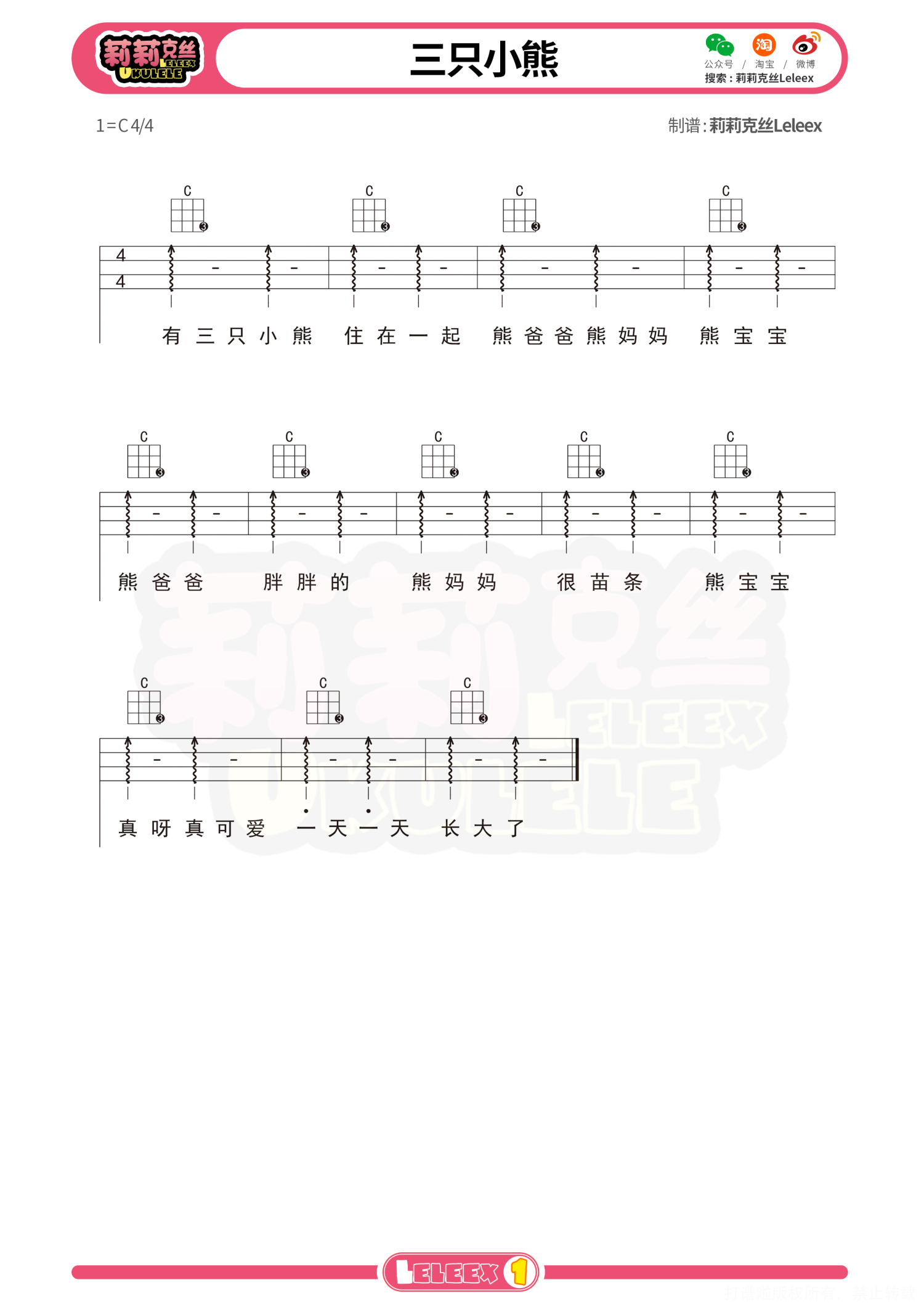 曲谱介绍: 简单《三只小熊》尤克里里曲谱 更多尤克里里曲谱/教学  关注@莉莉克丝Leleex