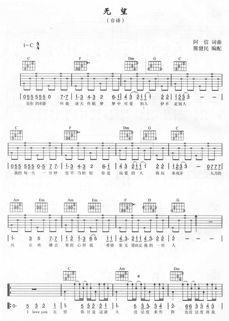 曲谱介绍: 五月天《无望》吉他弹唱谱,采用C调指法编配,熊健民编配出品,共有2张高清图谱,免翻页排版设计。