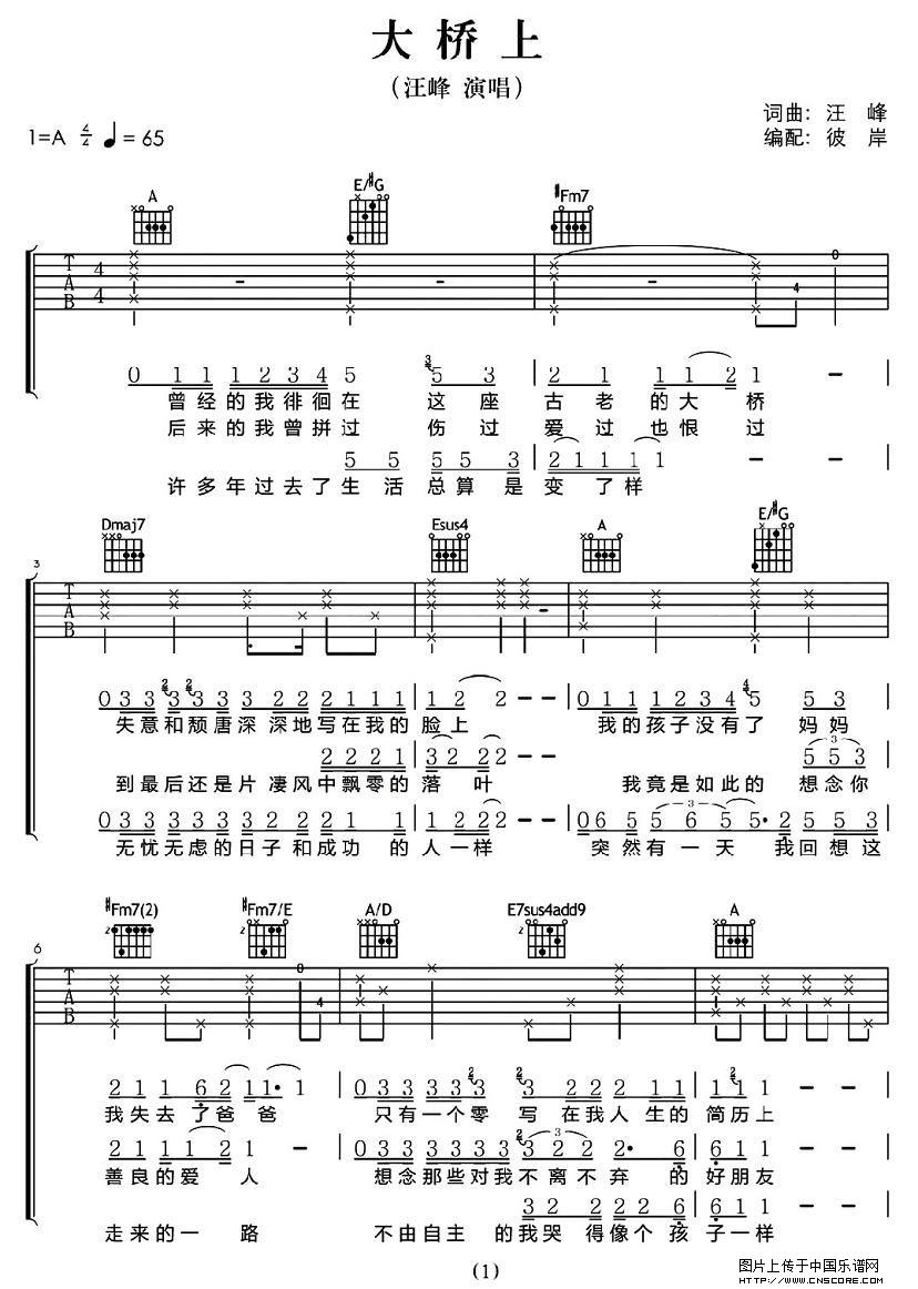曲谱介绍: 汪峰《大桥上》吉他弹唱谱,采用A调指法编配,彼岸吉他编配出品,共有3张高清图谱。