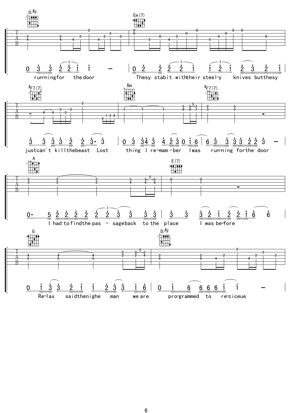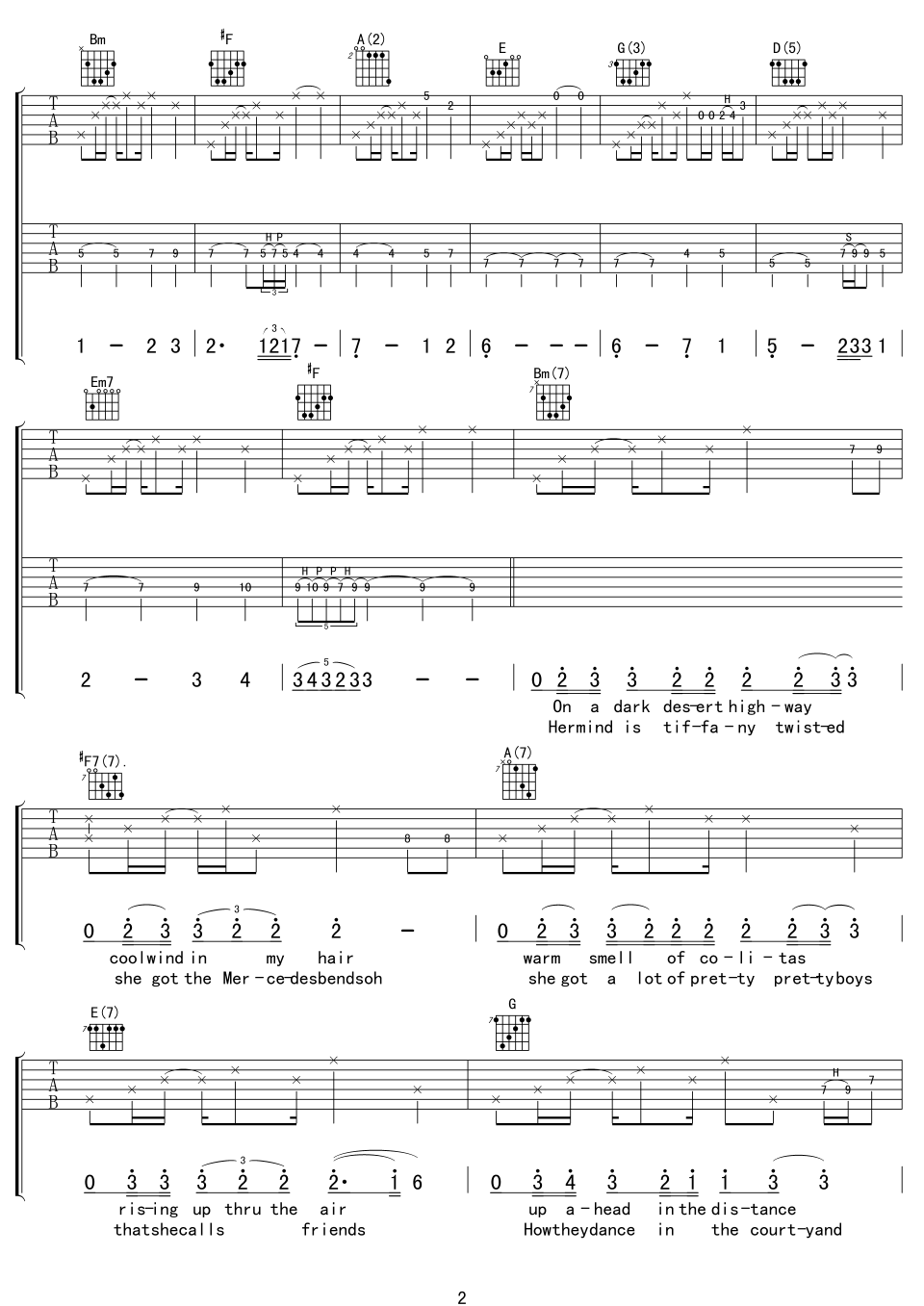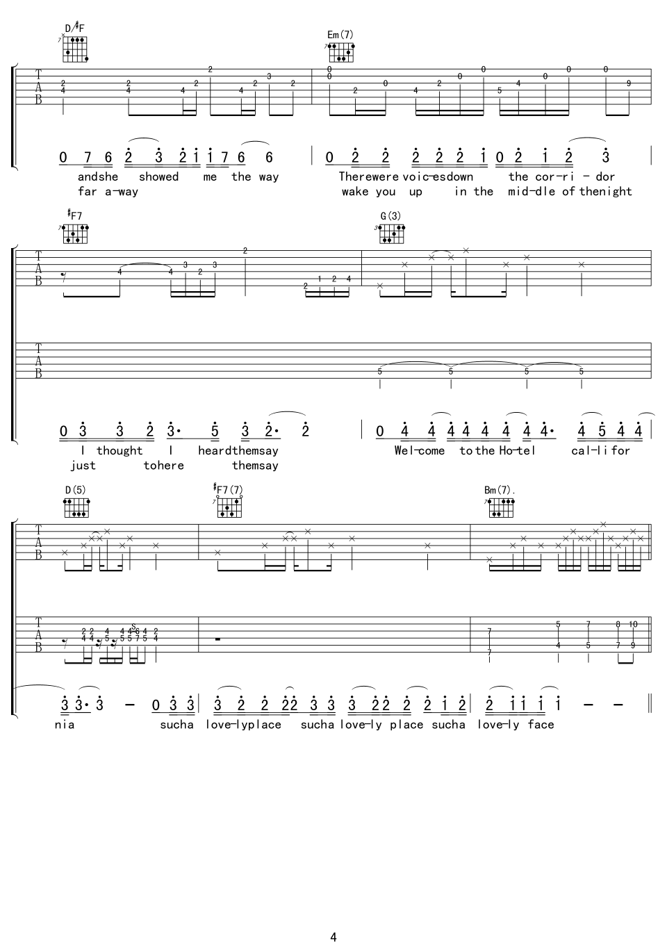 曲谱介绍: hotel《hotelCalifornia》吉他弹唱谱,采用D调指法编配,中文吉他音乐社区编配出品,共有8张高清图谱。