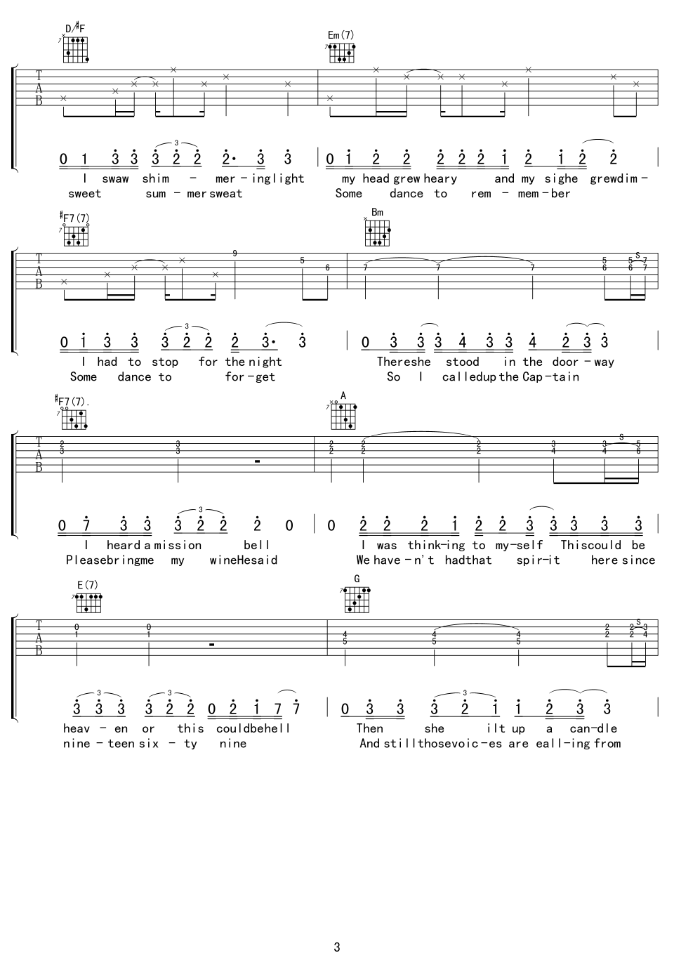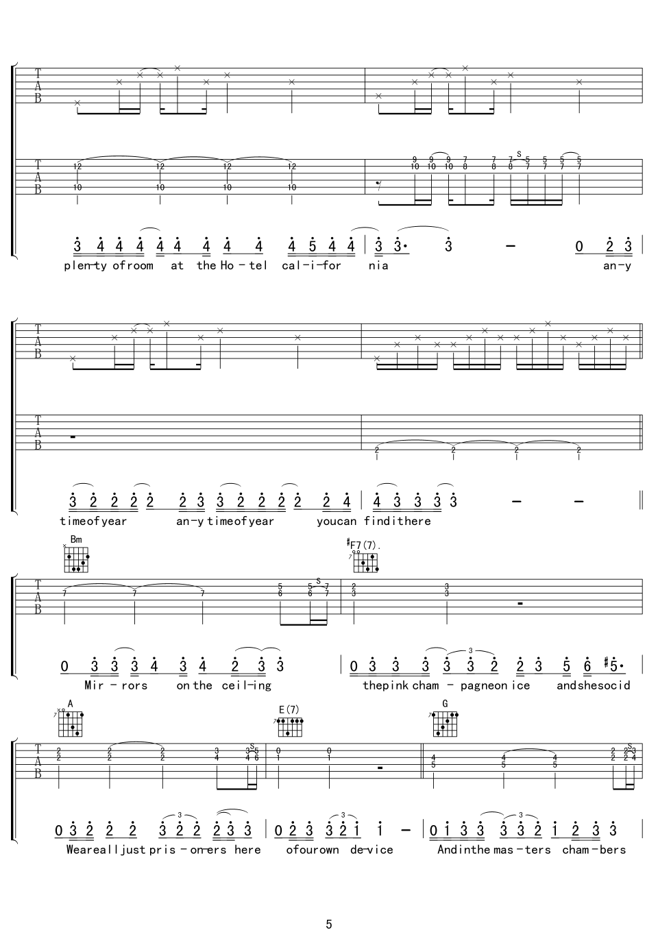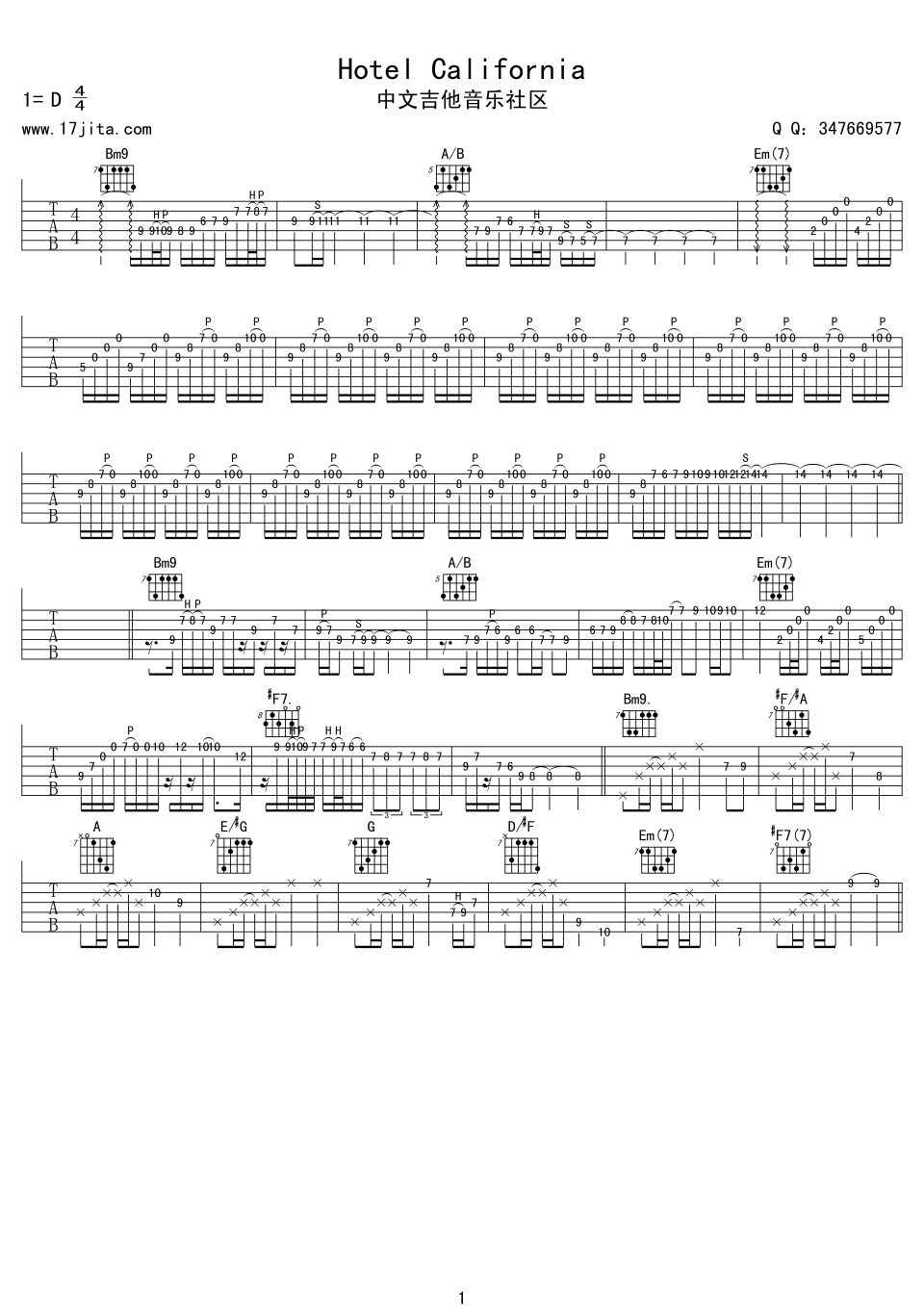 曲谱介绍: hotel《hotelCalifornia》吉他弹唱谱,采用D调指法编配,中文吉他音乐社区编配出品,共有8张高清图谱。