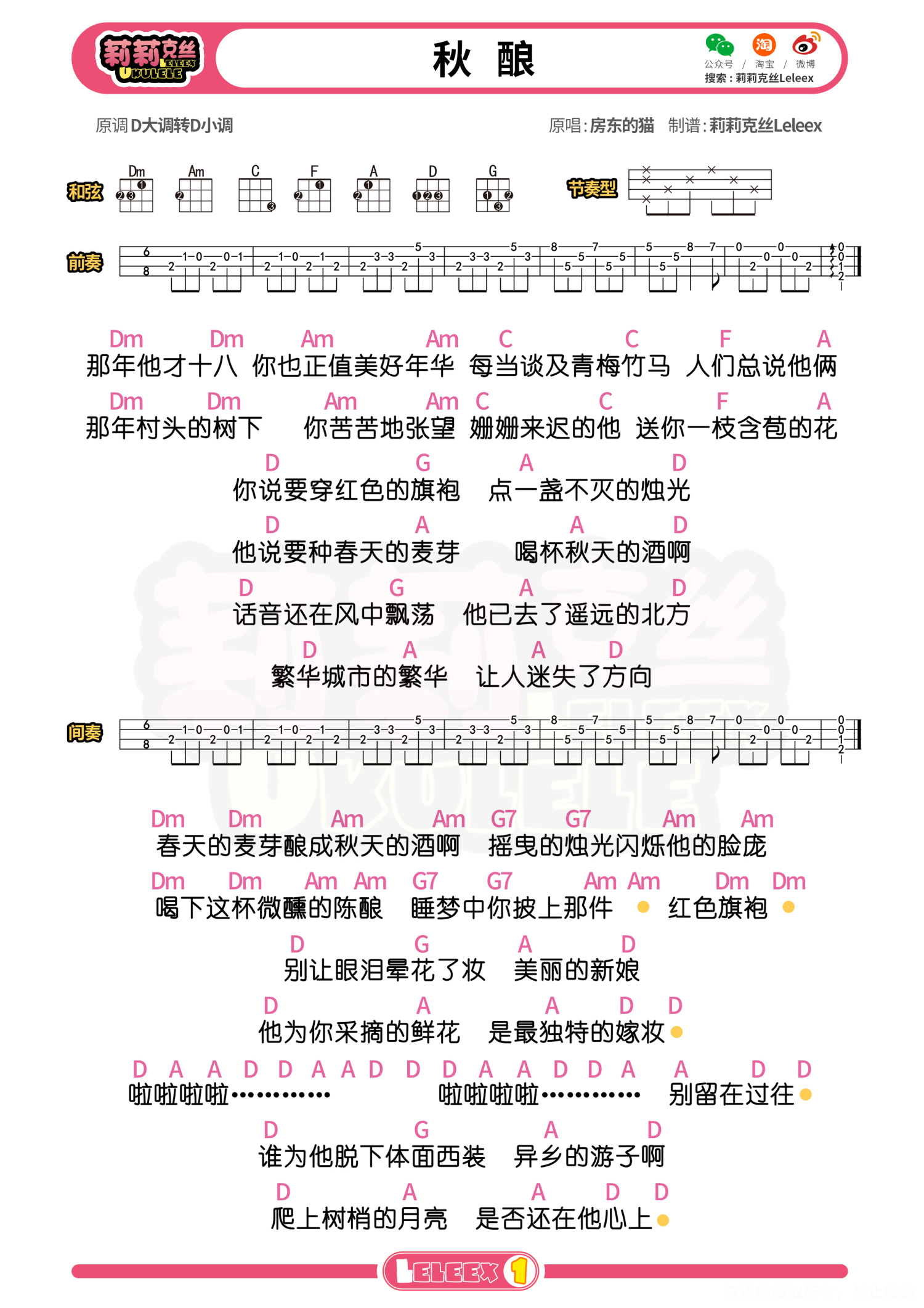 曲谱介绍: 《秋酿》尤克里里曲谱 更多尤克里里曲谱/教学  关注@莉莉克丝Leleex