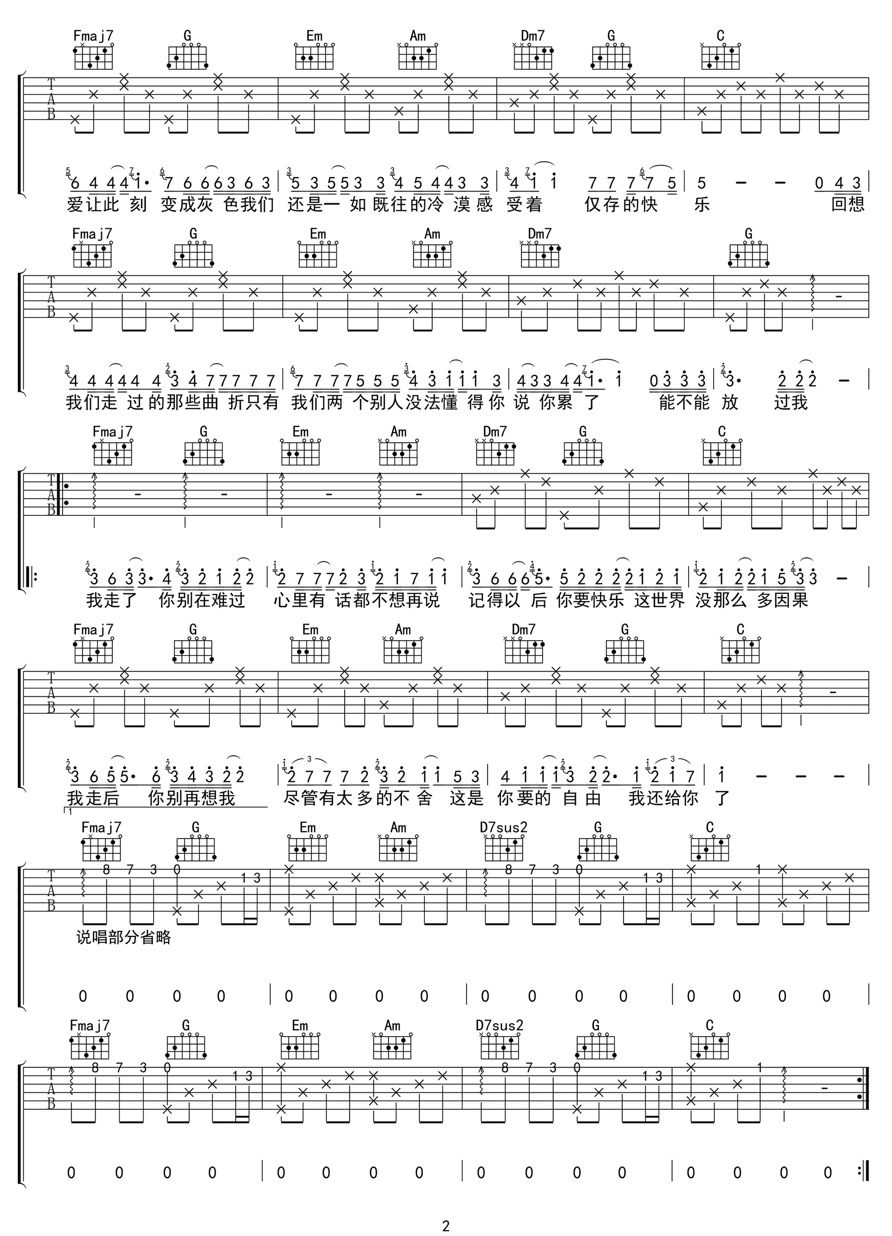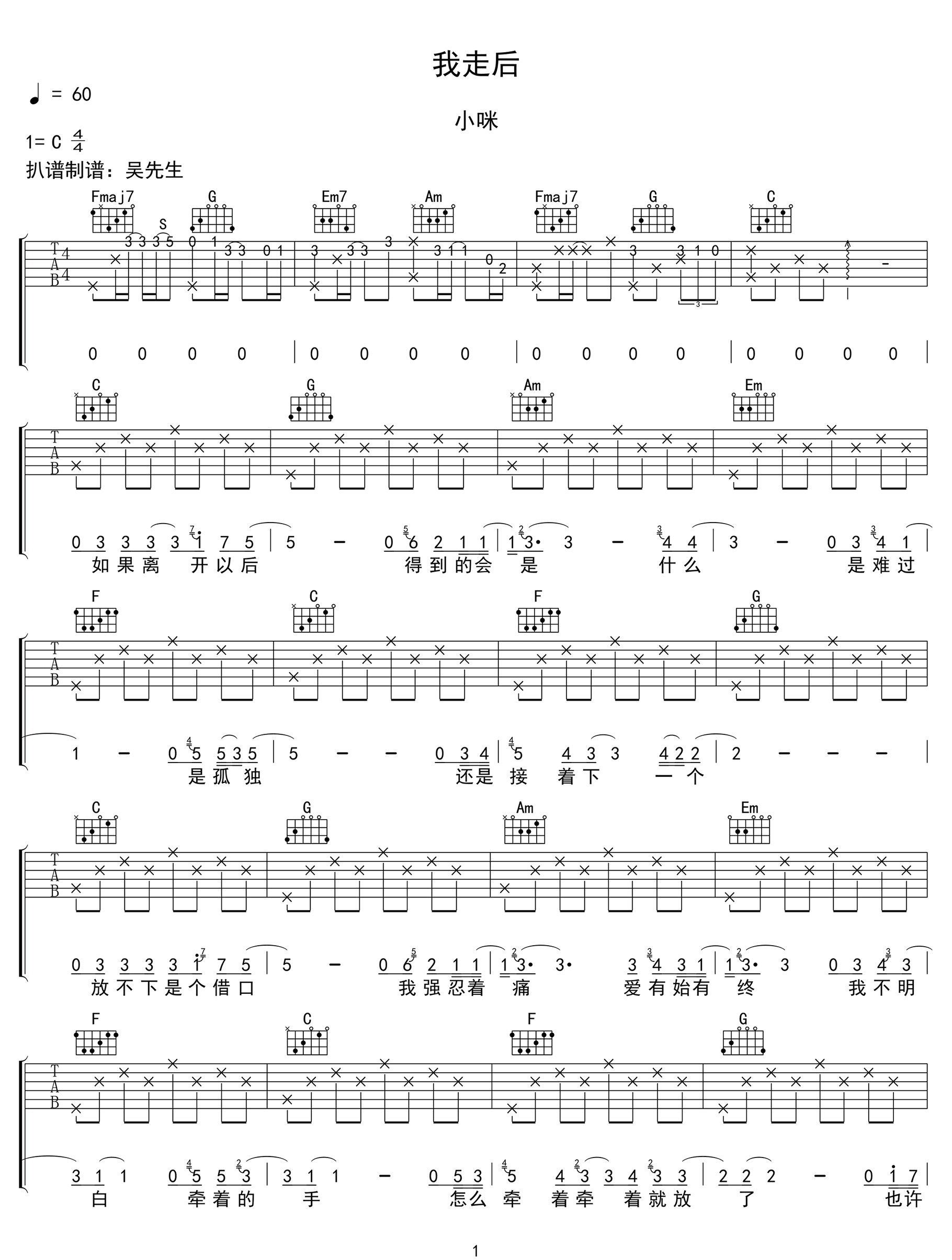 曲谱介绍: 吉他经常给我很多的满足。要想得到吉他给你带来的好处,你就必须付出努力。 我走后吉他谱_小咪_《我走后》C调原版弹唱谱_高清六线谱分享,《我走后》是由小咪演唱的一首歌,希望你遇到一个,和你真正绝配的爱人,用最舒服的方式相爱,一生很长彼此打磨,去成为最默契的那一对,你为他改一点,他为你改一点,然后过完这一生。 此版本的曲谱来源于吴先生扒谱制谱,这里歌曲采用C调指法根据原版进行编配,演唱时根据自己的嗓音情况夹变调夹。这首歌难度不大,主要难点在于前奏和伴奏中的部分旋律音,和弦及节奏都比较简单。 我走后吉他谱_小咪_《我走后》C调原版弹唱谱_高清六线谱1: