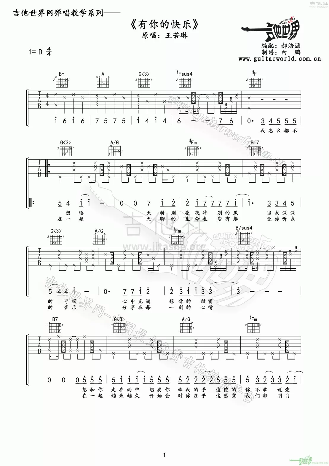 曲谱介绍: 王若琳《有你的快乐》吉他弹唱谱,采用D调指法编配,郝浩涵编配出品,共有3张高清图谱。