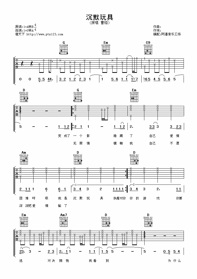 曲谱介绍: 曹格《沉默玩具》吉他弹唱谱,采用G调指法编配,阿潘音乐工场编配出品,共有4张高清图谱。