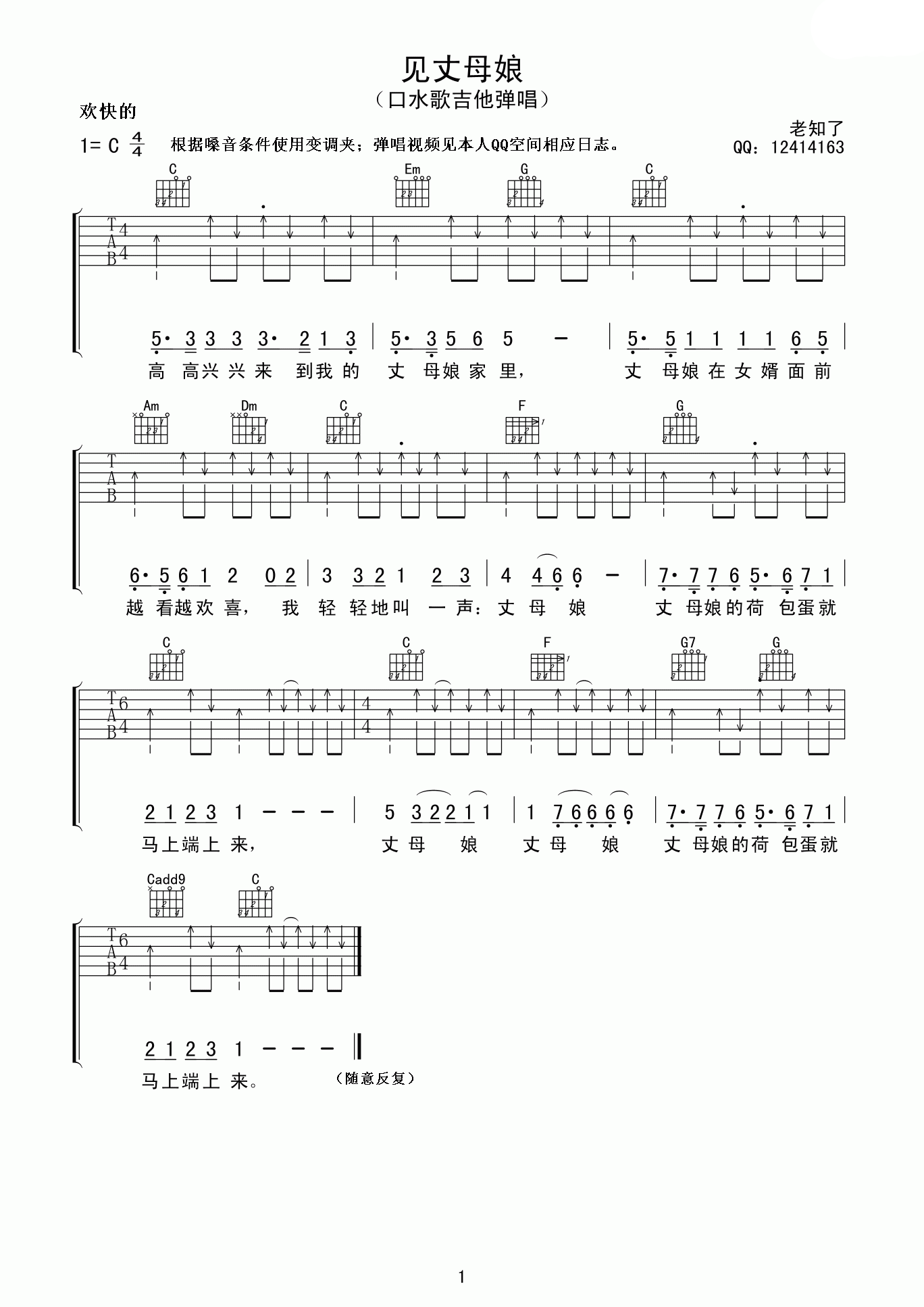 曲谱介绍: 口水歌《见丈母娘》吉他弹唱谱,采用C调指法编配,老知了编配出品,共有1张高清图谱,免翻页排版设计。