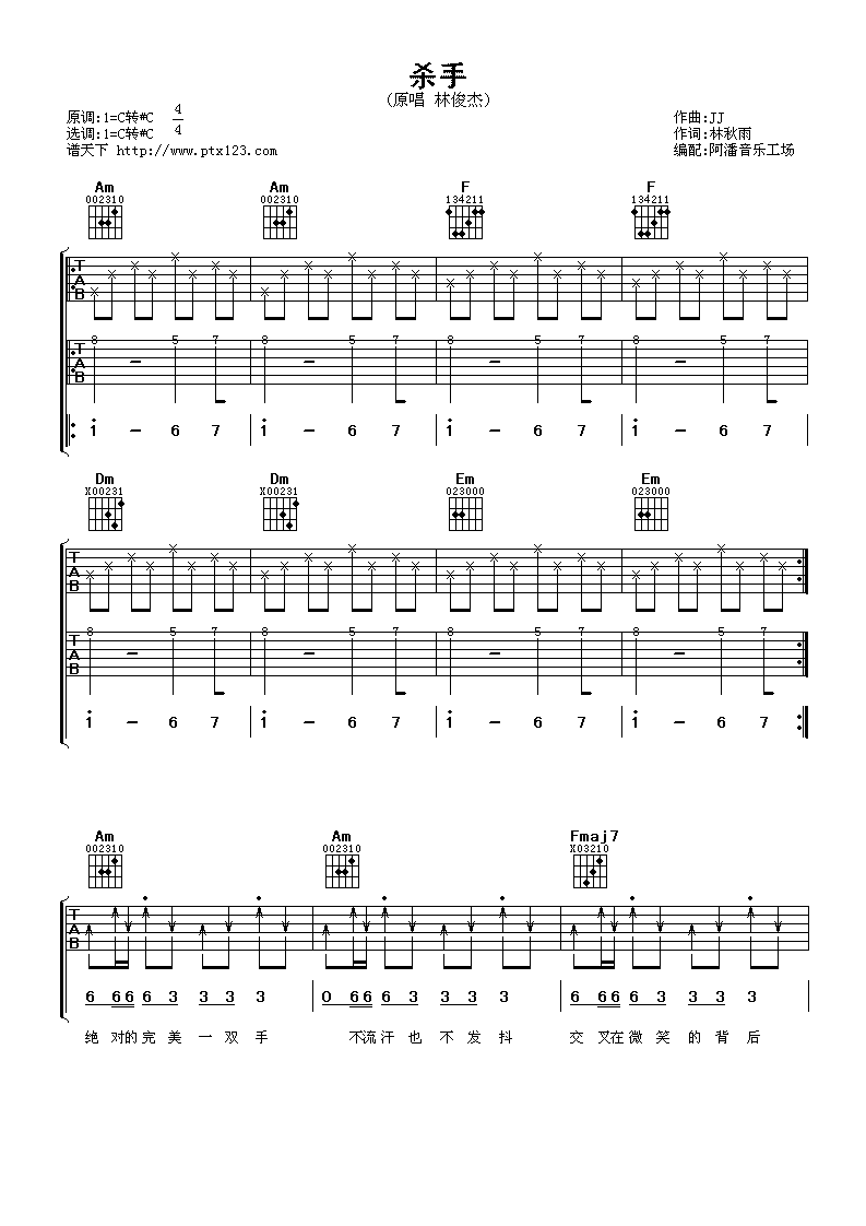 曲谱介绍: 林俊杰《杀手》吉他弹唱谱,采用C调指法编配,阿潘音乐工场编配出品,共有4张高清图谱。