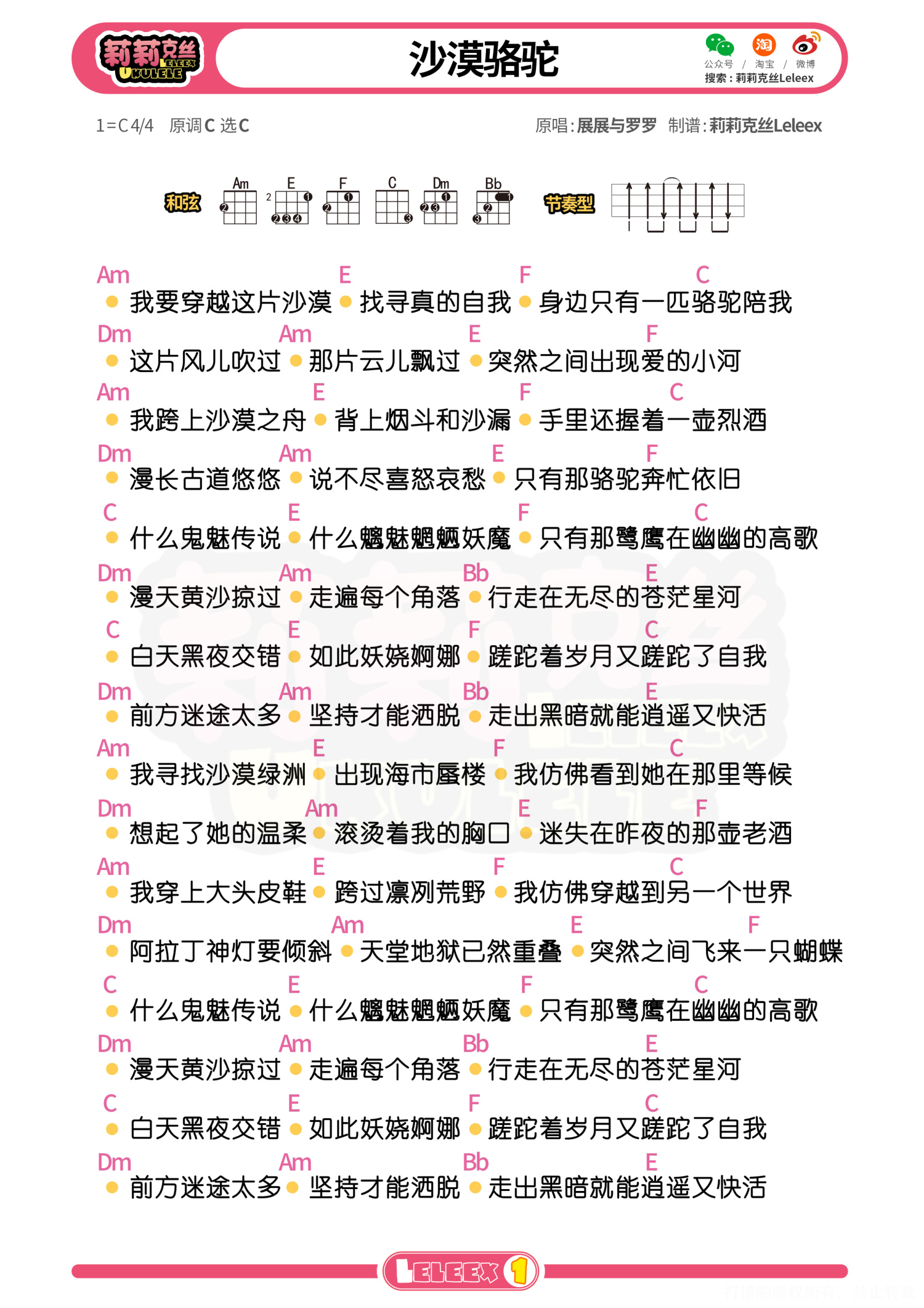 曲谱介绍: 《沙漠骆驼》尤克里里曲谱 更多尤克里里曲谱/教学  关注@莉莉克丝Leleex