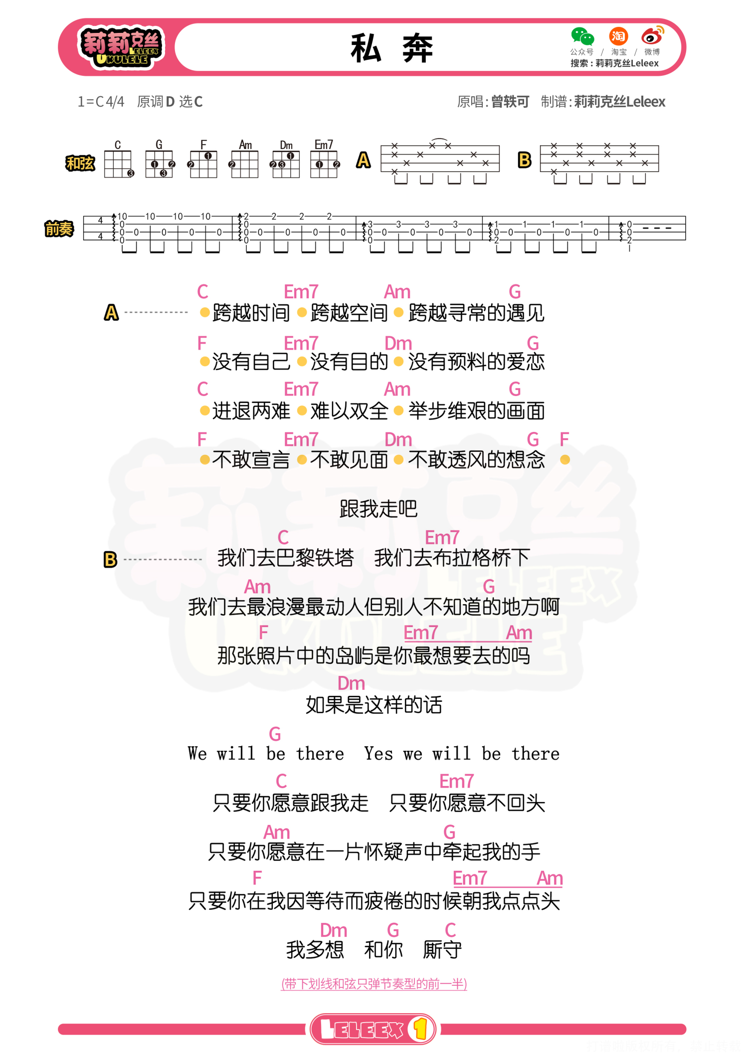 曲谱介绍: 「私奔」尤克里里曲谱 更多尤克里里曲谱/教学  关注@莉莉克丝Leleex