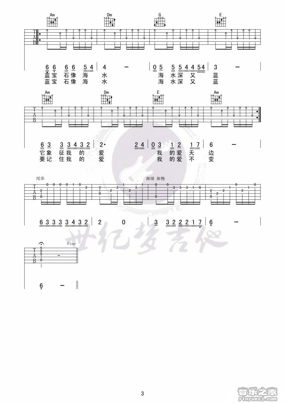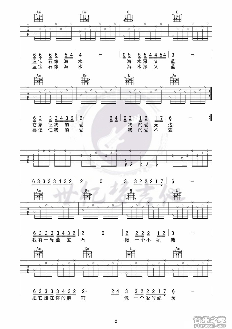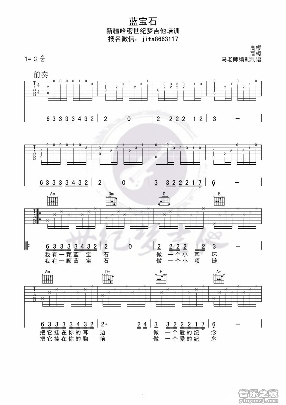 曲谱介绍: 高樱《蓝宝石》吉他弹唱谱,采用C调指法编配,世纪梦吉他编配出品,共有3张高清图谱。