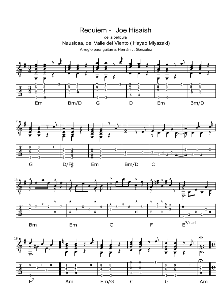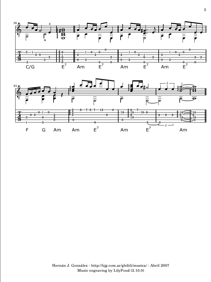 曲谱介绍: 久石让《风之谷》吉他独奏谱,采用C调指法编配,共有3张高清图谱。