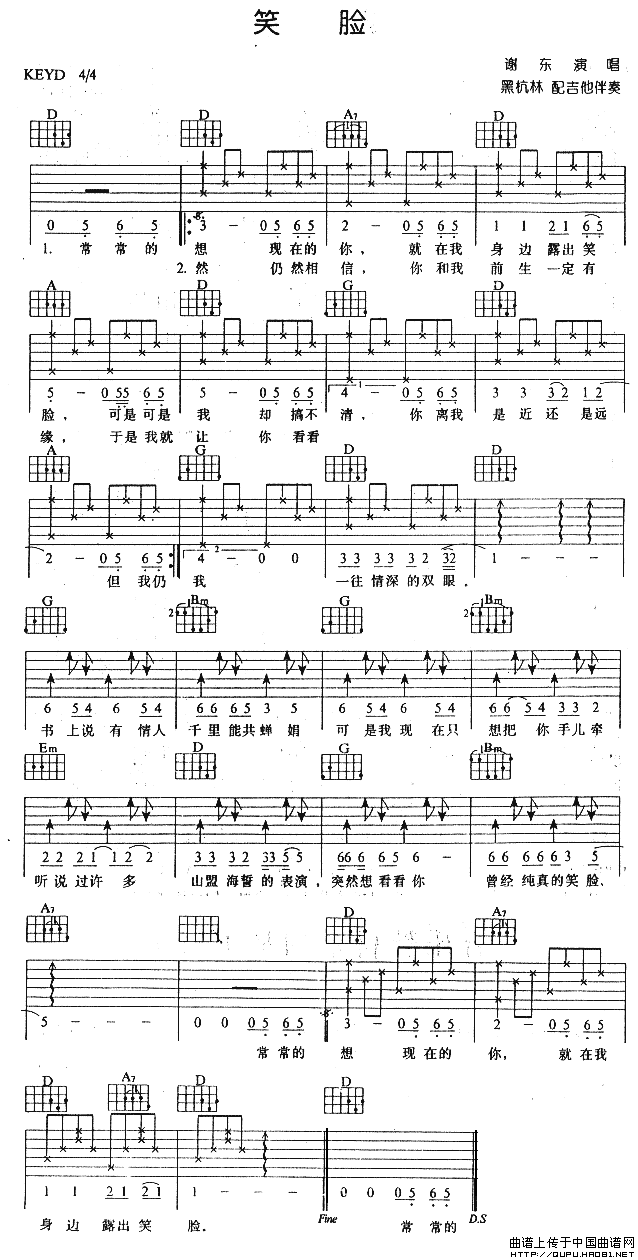 曲谱介绍: 谢东《笑脸》吉他弹唱谱,采用D调指法编配,中国曲谱网编配出品,共有1张高清图谱,免翻页排版设计。