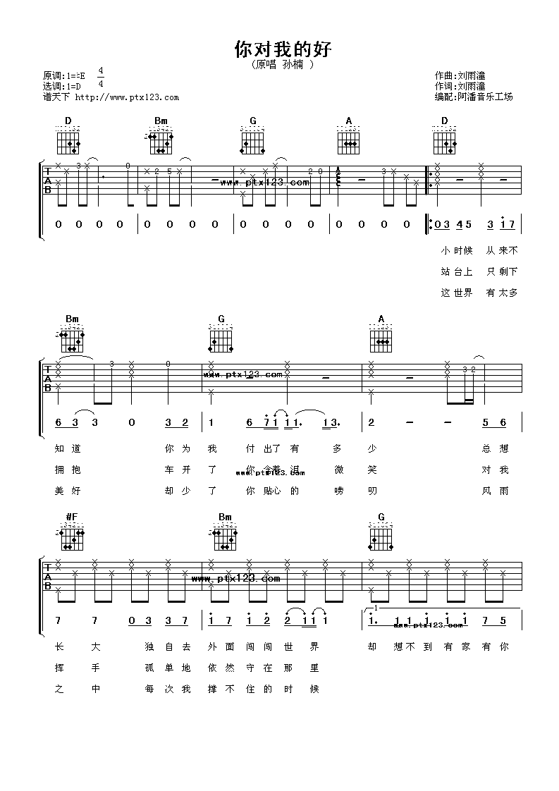 曲谱介绍: 孙楠《你对我的好》吉他弹唱谱,采用D调指法编配,阿潘音乐工场编配出品,共有3张高清图谱。