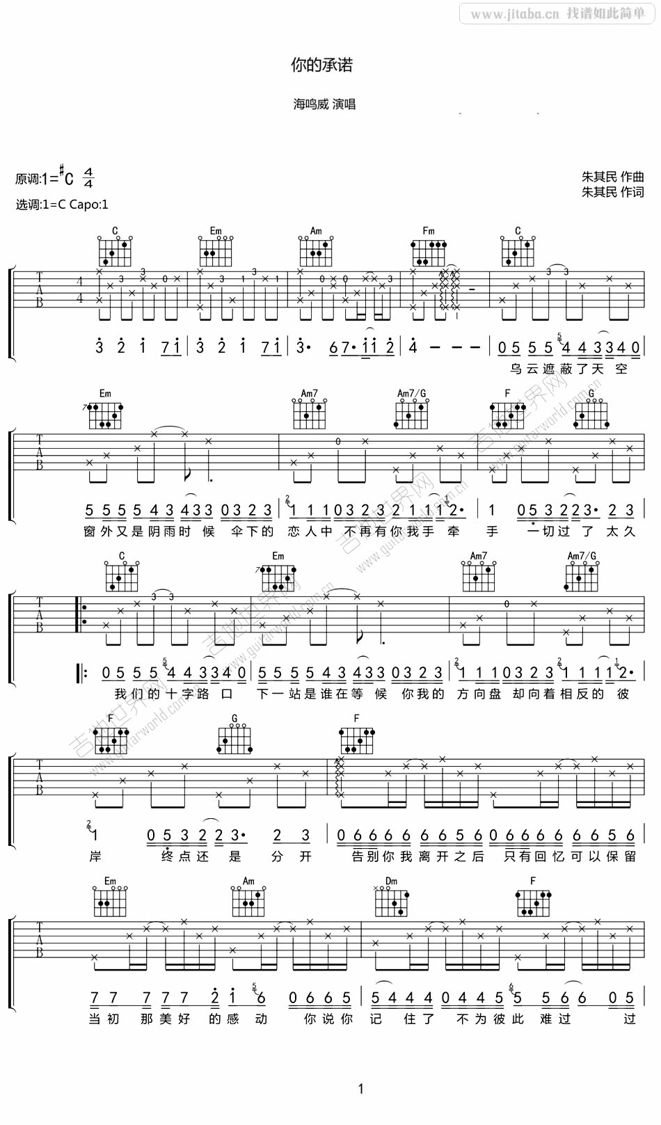 曲谱介绍: 海鸣威《你的承诺》吉他弹唱谱,采用C调指法编配,吉他世界编配出品,共有2张高清图谱,免翻页排版设计。