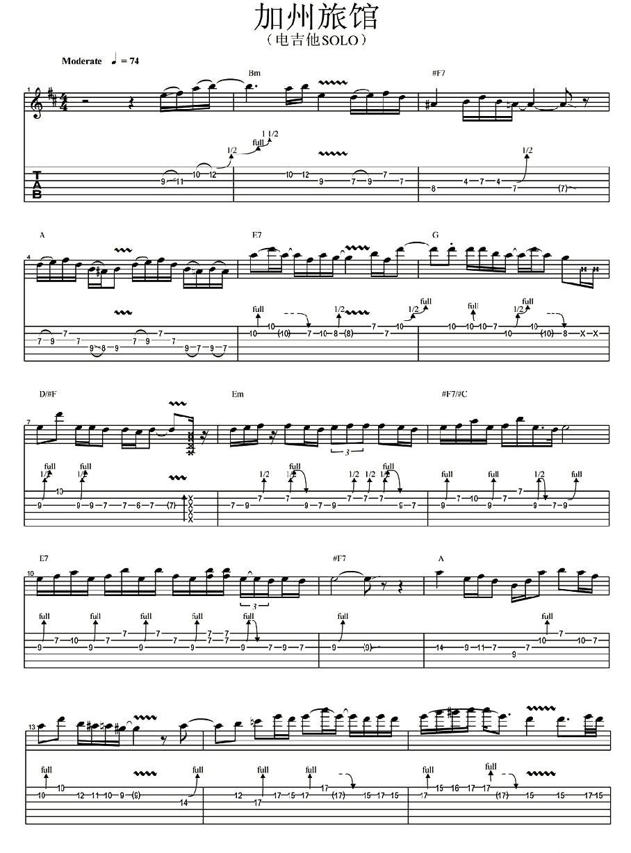 曲谱介绍: 老鹰乐队《加州旅馆solo》吉他独奏谱,共有2张高清图谱,免翻页排版设计。