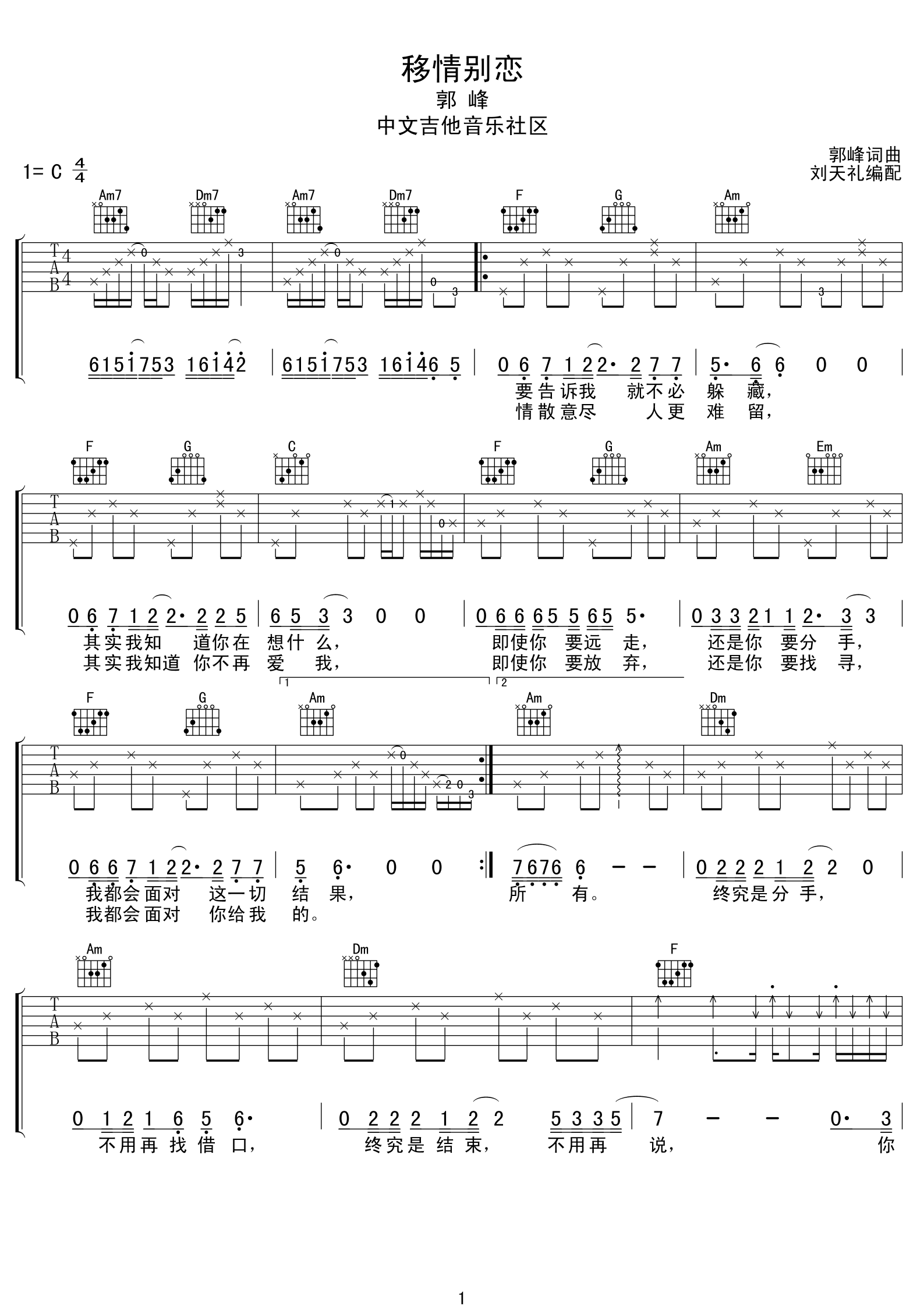 曲谱介绍: 郭峰《移情别恋》吉他弹唱谱,采用C调指法编配,刘天礼编配出品,共有2张高清图谱,免翻页排版设计。