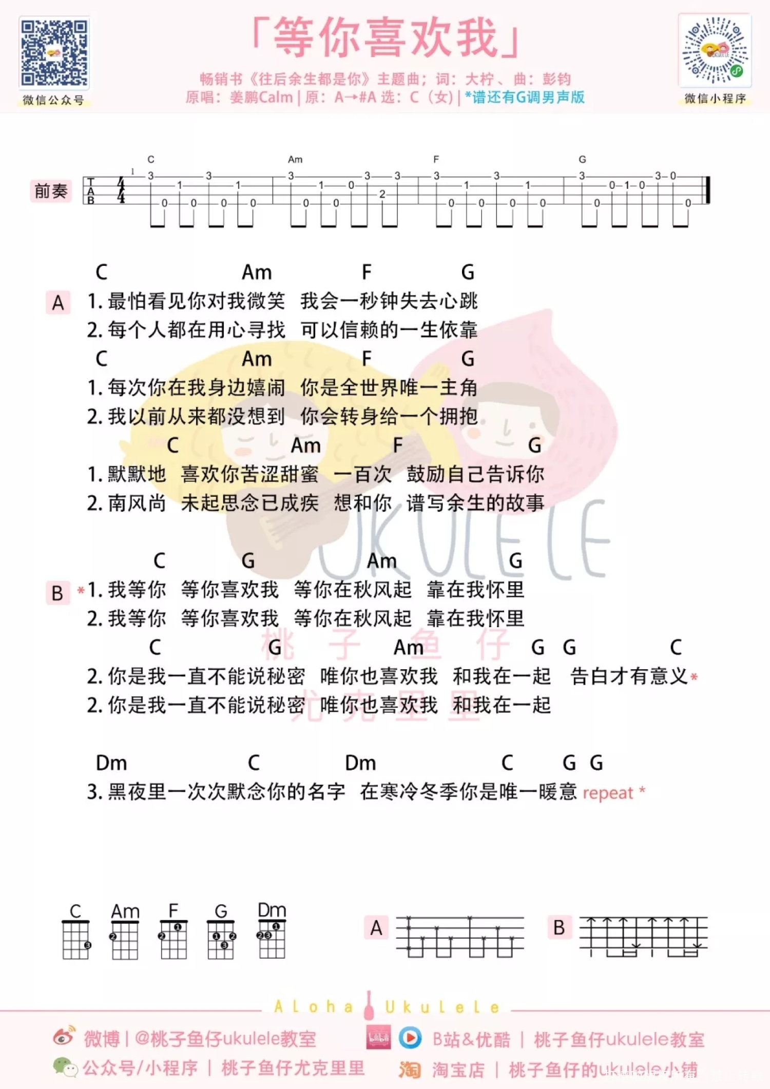 曲谱介绍: 最近小编到哪都躲不开“离婚”“分手”事件 好多网友都高呼:再也不相信爱情了! 那是别人的爱情~不关我们的事 我们会拥有自己很美好很温暖的爱情的。 所以,要一直相信呀。 今天推送的曲目是超甜的一首歌。 是畅销书《往后余生都是你》的告白主题曲《等你喜欢我》 愿真爱和温暖穿过时间的河流,来到你们身边   等你喜欢我尤克里里谱 1、女声版 2、男声版