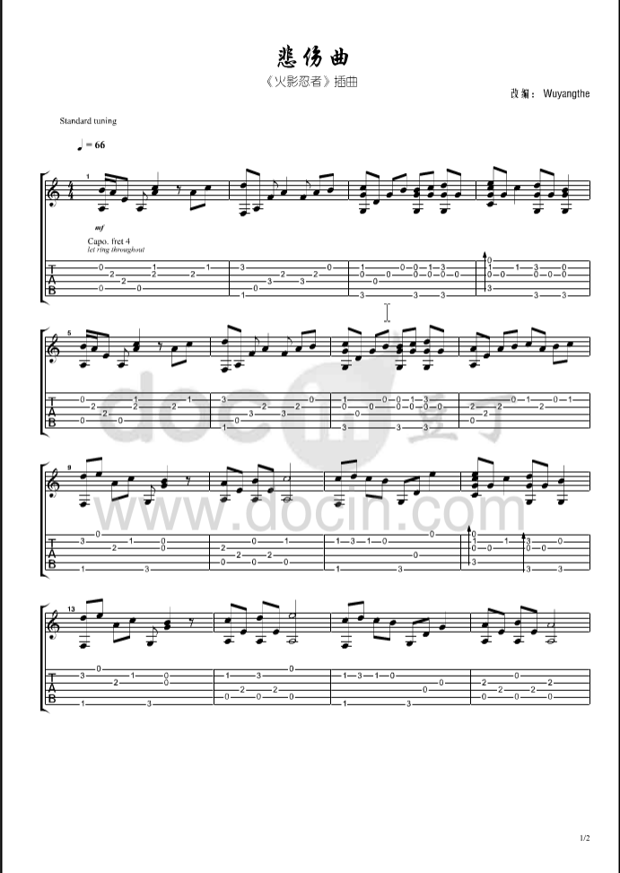 曲谱介绍: 火影忍者插曲《悲伤曲》吉他独奏谱,豆丁网编配出品,共有2张高清图谱,免翻页排版设计。