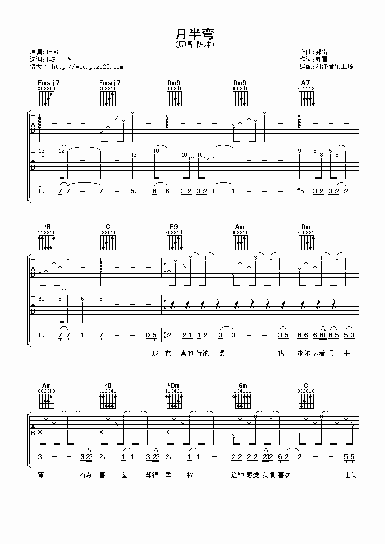 曲谱介绍: 陈坤《月半弯》吉他弹唱谱,采用F调指法编配,阿潘音乐工场编配出品,共有3张高清图谱。